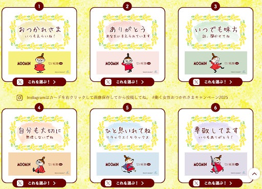 好きなカードを選んで、X(旧Twitter)またはInstagramに投稿するだけ!働く女性たちに、日々を頑張る自分に、エールを送り、ねぎらい、励ましあってみませんか?抽選で素敵なプレゼントが当たります!