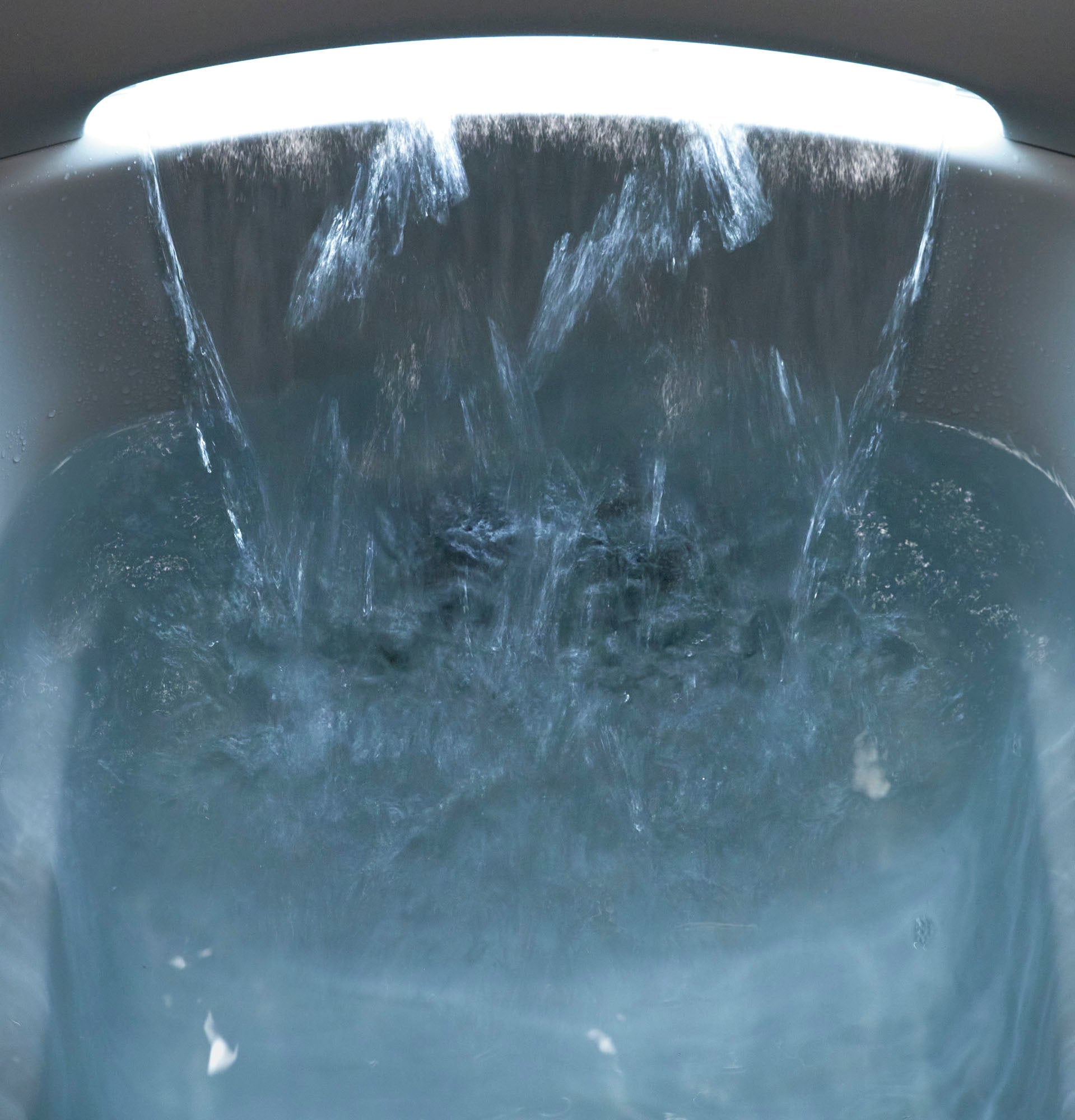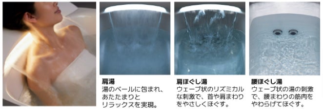 「肩湯」「肩ほぐし湯」「腰ほぐし湯」の3つの吐水が満喫できます。湯量や勢いにこだわりぬいたお湯のカタチ。心地よいお湯のベールに包まれ、あたたまりとリラックスを実現。まったく新しい入浴体験が満喫できます。