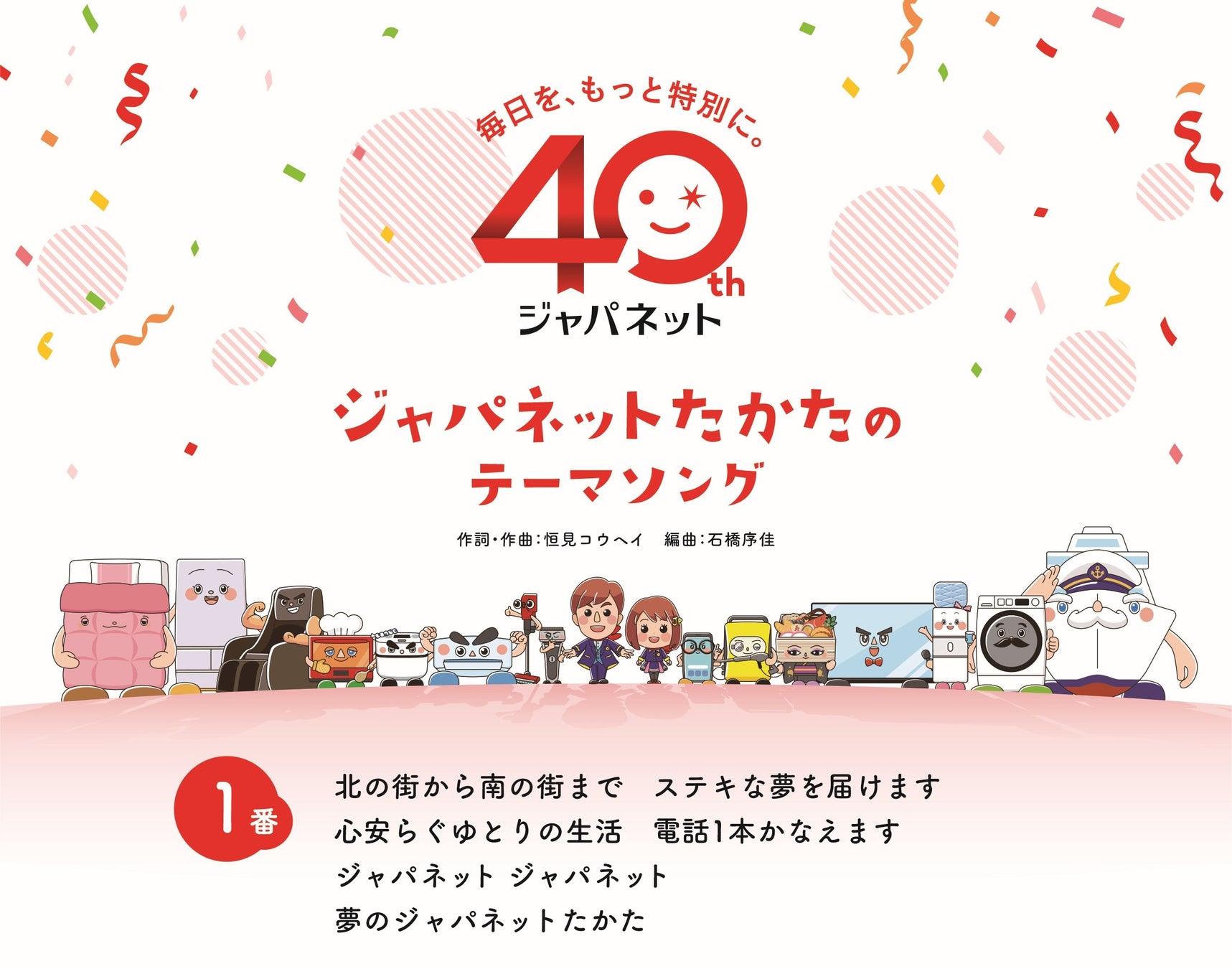 40周年の節目に、『ジャパネットたかたのテーマソング』の歌詞をリニューアル。今の「ジャパネット」を表現した歌詞へ進化しました。特設サイトではオリジナルデザインの歌詞カードを無料配布しております。
