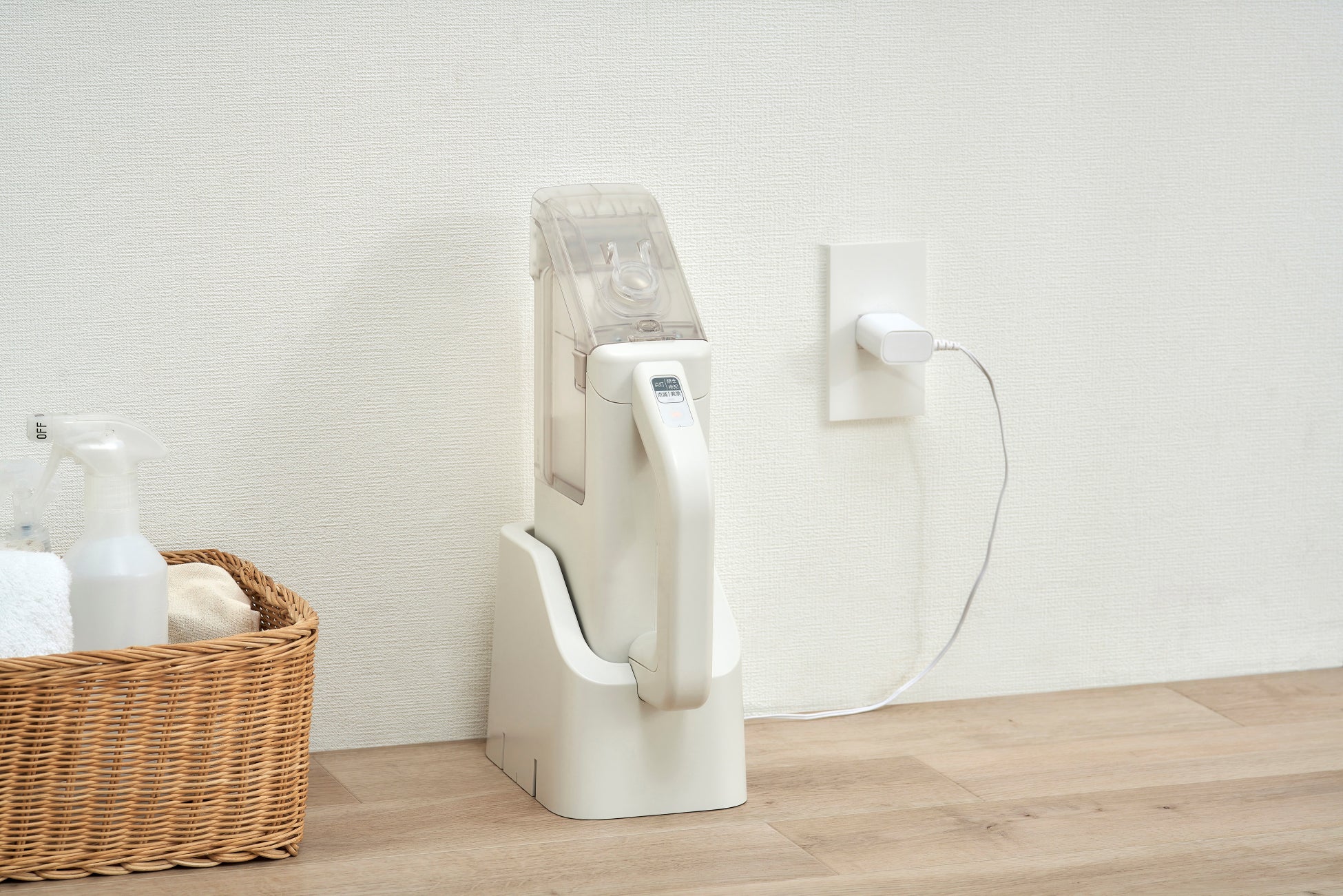 清水タンクを無くし、本体とハンドブラシ、バキュームホースを一体化することで、片手で操作・持ち運びしやすいサイズに小型化しました。付属の充電スタンドに縦に収納することで充電でき、コンパクトでシンプルなデザインのため、部屋の隅など部屋の雰囲気を損なうことなく収納できます。