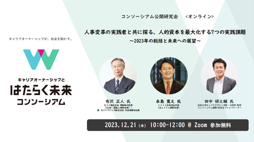 本イベントは、当コンソーシアム第3期(2023年度)の研究会活動の一環として実施するものです。経営戦略と人事戦略を連携させてきた人事変革の実践者、カゴメ株式会社 常務執行役員(元CHO(最高人事責任者))兼 カゴメアクシス株式会社 代表取締役社長 有沢正人氏、元ニトリ人事責任者・トイトイ合同会社代表 永島寛之氏のお二人を招き、当コンソーシアムの顧問・ファシリテーターを務める法政大学キャリアデザイン学部・大学院 田中 研之輔 教授と「人事変革の実践者と共に探る、人的資本を最大化する7つの実践課題~2023年の総括と未来への展望~」をテーマに、企業が人的資本を最大化していく中で、今まさに直面している7つの課題について語り合います。