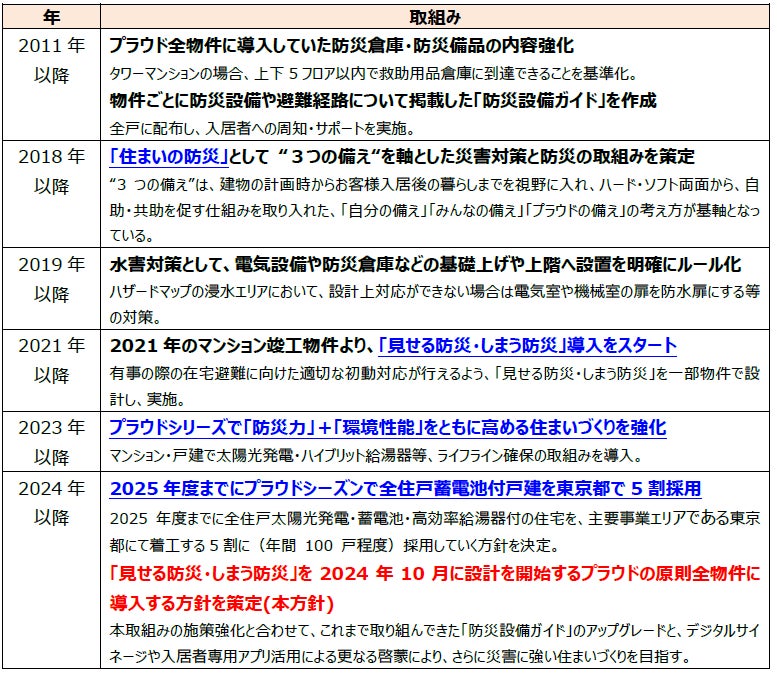 当社は2021年11月に竣工した「プラウド瑞江」を皮切りに本取組みをスタートさせてから、2024年8月までにプラウドの計13物件(プラウドタワー小岩ファースト、プラウド大宮桜木町等)において本取組みを導入してまいりました。近年関心の高まっている災害の備えに加え、ライフスタイルの変化に伴う短期間居住や賃借人にも配慮し、「見せる防災」と「しまう防災」の両方を一緒に備えることがより効果的だと判断し、今後はプラウドの原則全物件に導入する方針を策定いたしました。(対象:2024年10月以降に設計開始の物件)また、各地域の防災情報やデジタルの活用・連携も積極的に行ってまいります。