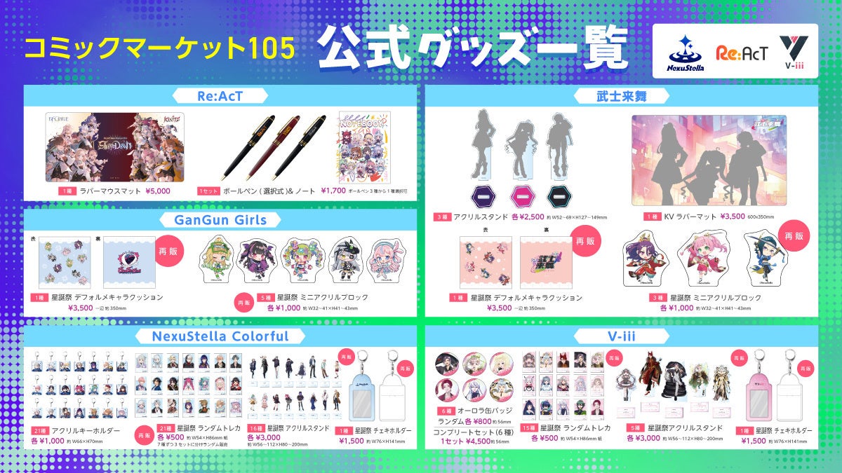 コミックマーケット105にて、「NexuStella(ネクサステラ)」「V-iii」および「Re:AcT」の冬コミグッズの発売を行います。また、2024年12月1日(日)に開催されたNexuStella1周年記念イベント「NexuStella FESTIVAL 星誕祭 - 2024 -」にて販売された各種グッズに関して、今回の冬コミにて再販が決定いたしました。グッズの内容等は以下の画像を参照ください。
