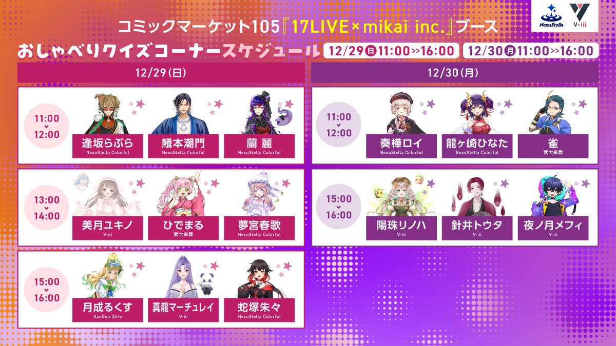 17LIVE株式会社(東京都渋谷区、代表取締役:ジャン・ホンフイ、URL:https://jp.17.live/)が運営するVライバープロダクション「NexuStella(ネクサステラ)」「V-iii(ヴィースリー)」、また本年11月に当社グループに加入した株式会社mikaiが運営するVTuber事務所「Re:AcT(リアクト)」では、「17LIVE × Re:AcT」として、2024年12月29日(日)〜30日(月)にかけて東京ビックサイトで開催される「コミックマーケット105」に共同で出展することを決定しましたので、お知らせいたします。
