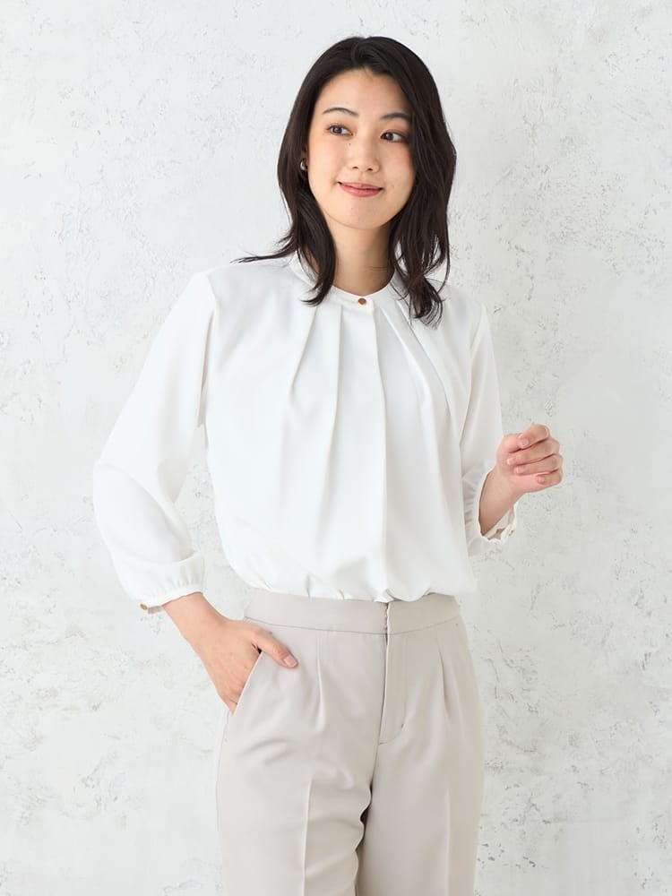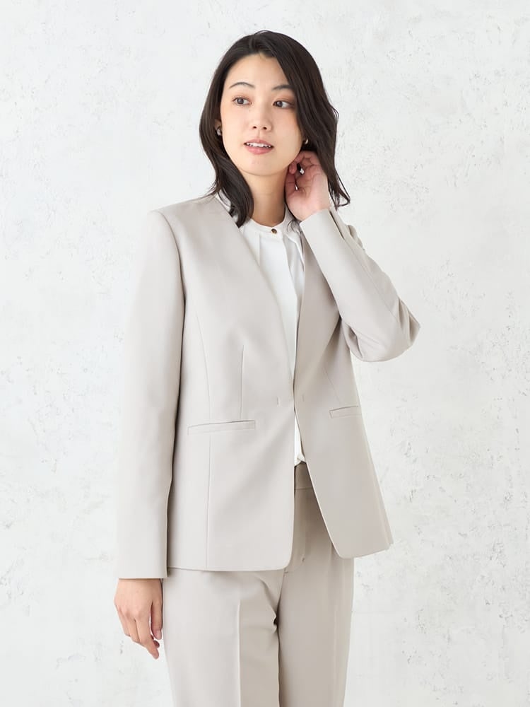 4.きちんと感を保ちながらも女性らしい柔らかな印象のノーカラースタイルで、様々なシーンに対応