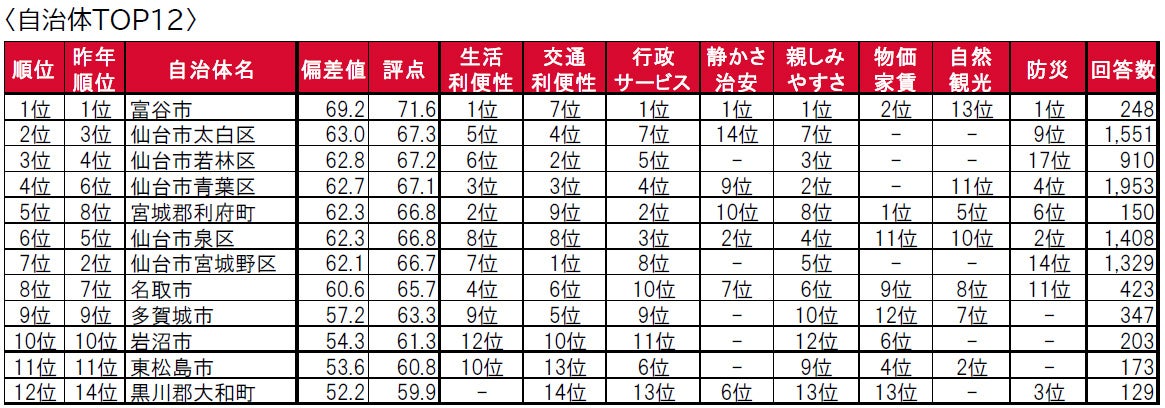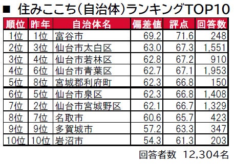 1位は、仙台市のベッドタウンで大型商業施設が多い富谷市で、4年連続で安定した高い評価を得ています。2位は仙台市太白区、3位は仙台市若林区です。