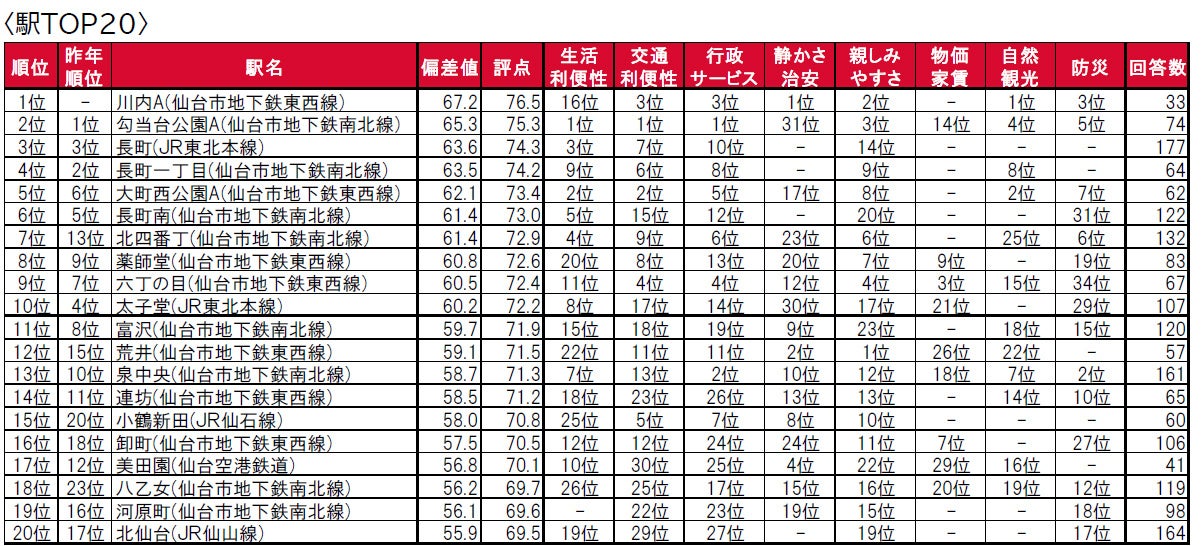 1位は、東北新幹線の「仙台駅」・JR仙石線の「あおば通駅」・仙台市地下鉄東西線の「宮城野通駅」を統合した仙台A、2位は、長町で、いずれも4年連続で選ばれる結果となっています。なお、両駅は仙台都市圏在住のみを対象とした「住みたい街(駅)ランキング<仙台都市圏版>」2019年版と2020年版でもそれぞれ1位と2位になっています。3位は長町南で、トップ3は全て仙台市にある駅となっています。