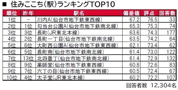 1位は、昨年は回答者数が30名未満だったため集計対象外だった仙台市青葉区にある川内Aです。東北大学川内キャンパスの目の前にある「川内」と、青葉山公園や西公園に囲まれている「国際センター」を統合しています。2位は、昨年まで3年連続で1位だった勾当台公園A、3位は、3年連続で長町という結果になっています。