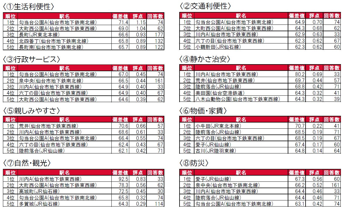 ●「生活利便性」因子では、仙台市の中心部にある駅(勾当台公園A・大町西公園A・長町など)の評価が昨年に引き続き高くなっています。
