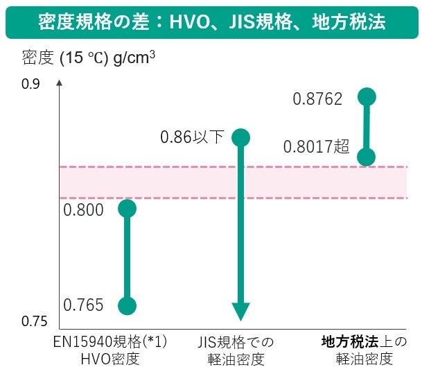 HVOは、バイオマス(生物資源)原料を水素化処理した燃料(水素化処理植物油)です。ドロップイン燃料※6として、軽油と混合でも単独でも利用することが可能であり、また、石油由来の軽油使用時と比較してCO2排出量の削減効果が高いため、脱炭素社会実現に貢献する燃料として欧州を中心に利用が拡大しています。しかし、100%のHVOは日本の地方税法第144条、いわゆる軽油取引税が定める軽油の密度の下限値を下回るため(図1)、公道走行に使用するためには、この地方税法に基づき、製造承認を受けている施設で軽油と混合して軽油規格に適合させる必要があります。