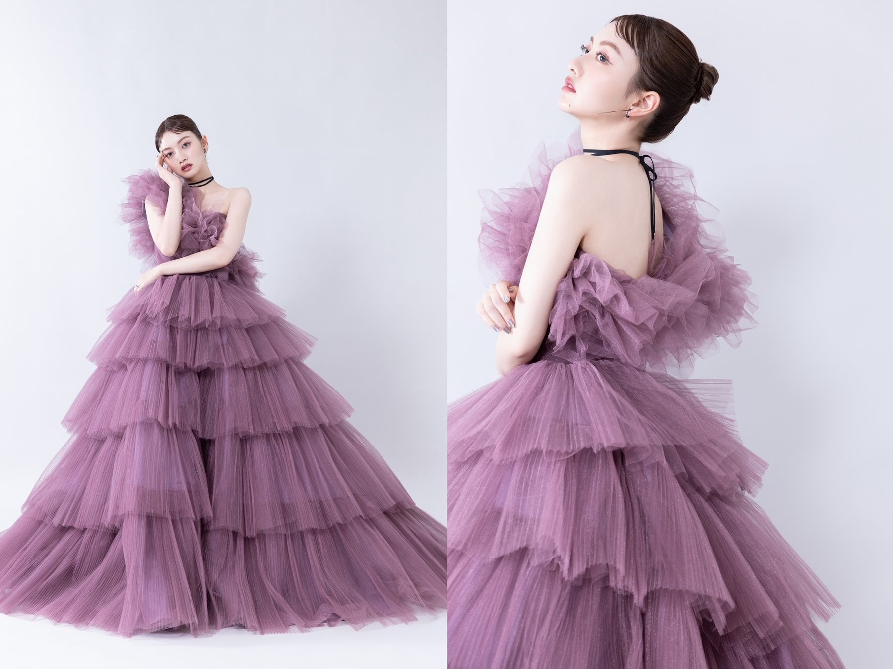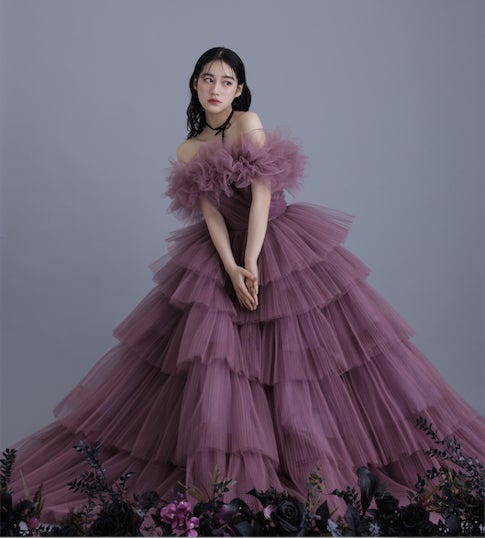 今季トレンドの上品なグレーパープルのカラードレス。細やかに光り輝くグリッターチュールを上品に奥に潜ませ、何重にも重ねたチュールスカートをスカラップ状に切り替えたデザインが魅力的なドレス。チュールスカートの切り替えをあえて低い位置に設定した一癖加えたデザインで、ウエストはしっかりマークすることで脚長効果もしっかりと◎取り外しが可能なプリーツを挟んだ胸元のボリュームフリルもデコルテラインを美しくダイナミックに華やぎます。