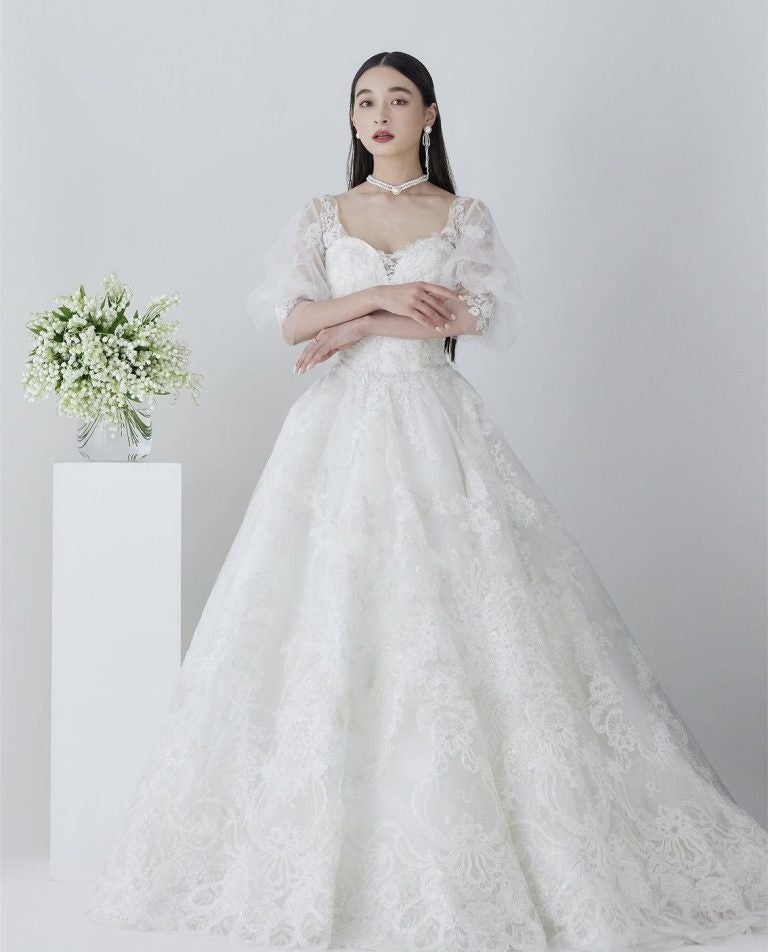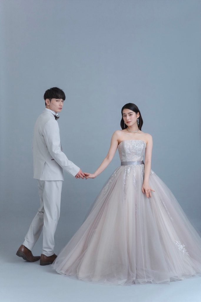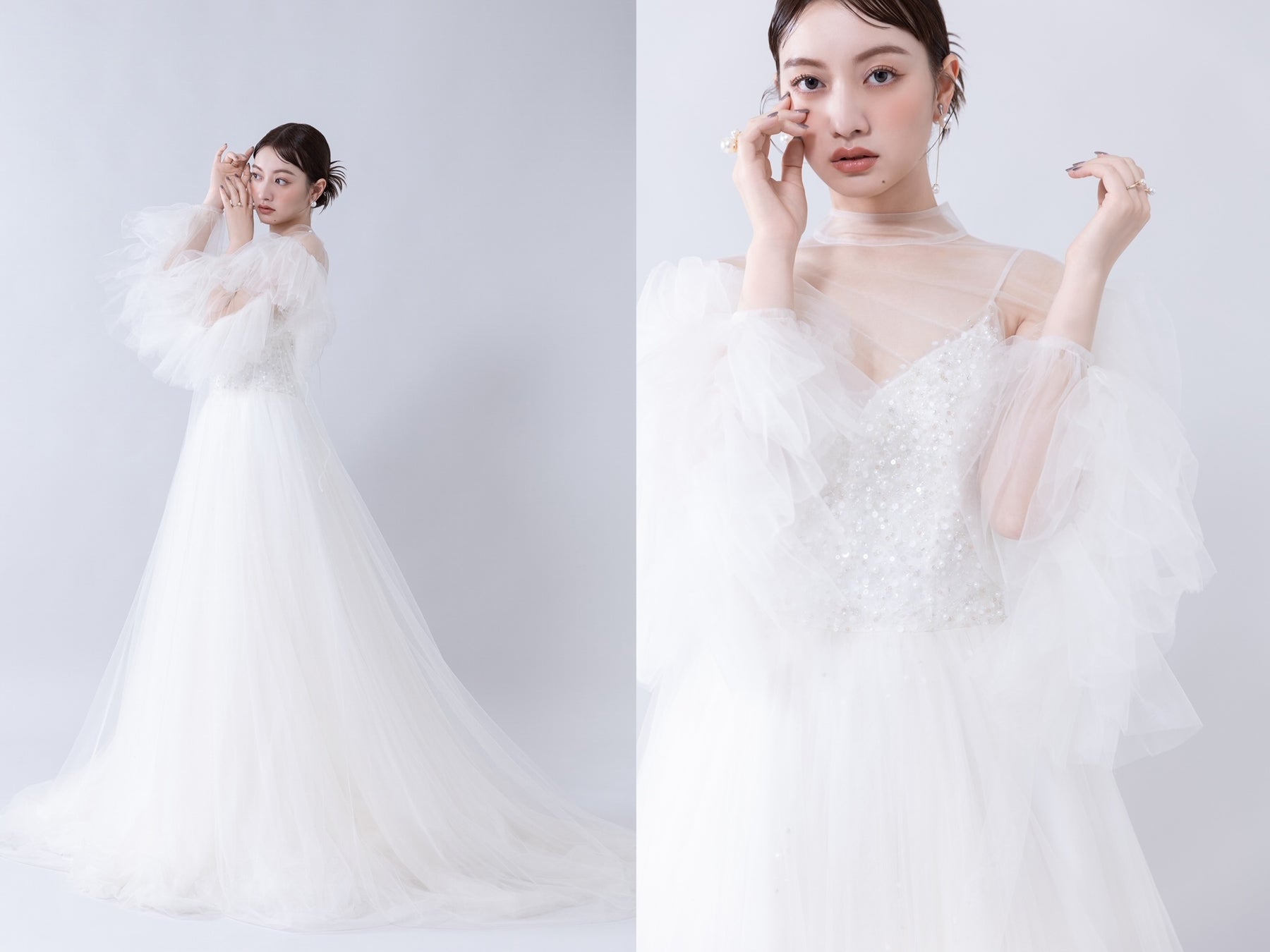 上質な素材感とパターンにこだわり抜いた大人ウェディングを彩るドレス。圧倒的なソフト感と透明感を誇る生地メーカーの新商品「ミスティチュール」をメイン素材にふんだんに使用し、よりエアリーなシルエットを演出。取り外しアイテムでガラッと印象チェンジが可能。4種類のスタイリングからお好みのスタイルを選択。