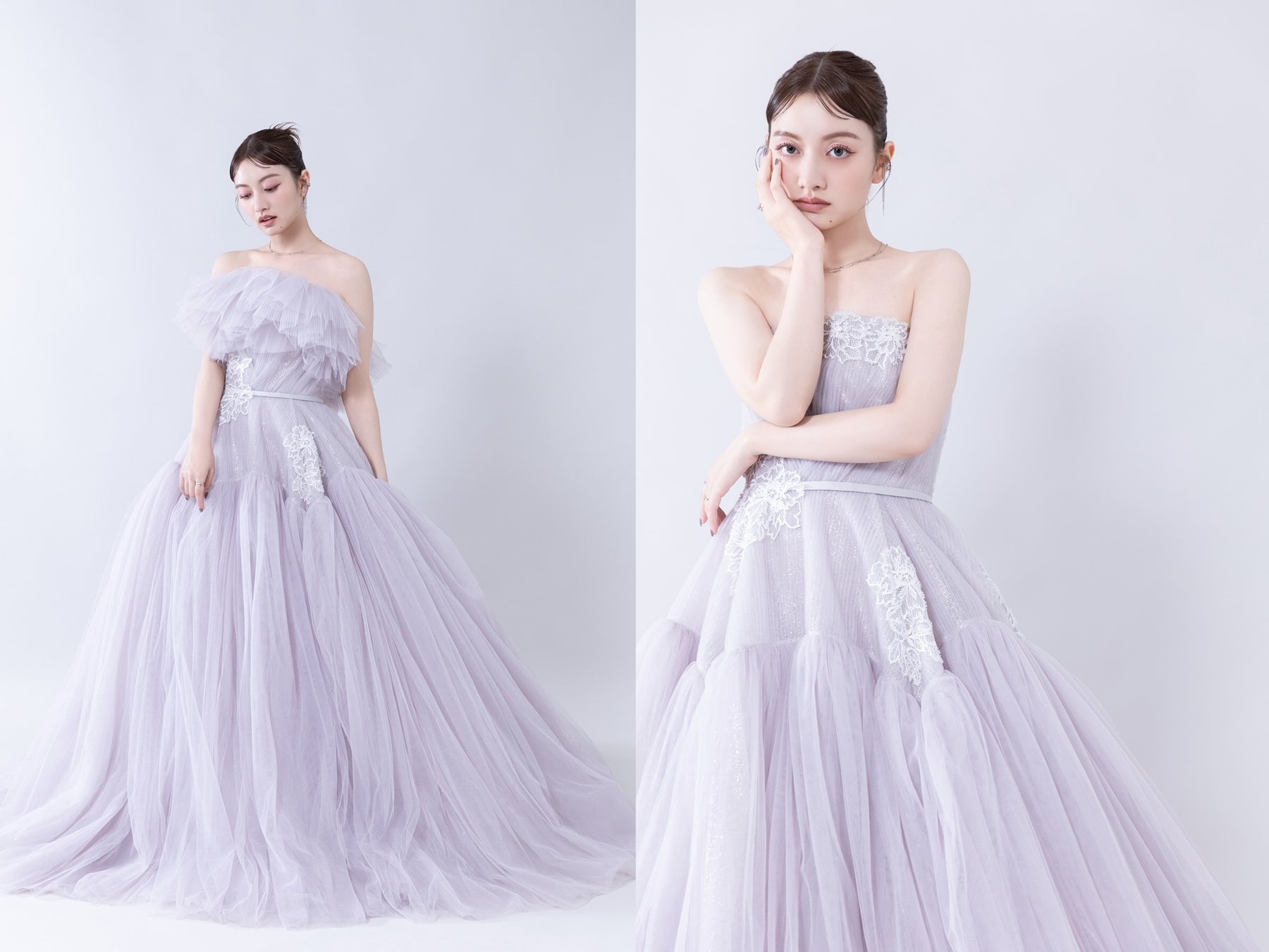 優しく上品に輝く、プリーツを掛けたスパークチュールを贅沢に使用。絶妙なニュアンスカラーのパープルが華やか且つ上品な印象のドレス。