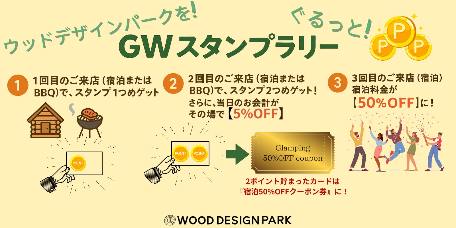 〜スタンプ2つで、グランピングが半額!GWはめぐってトクするウッドデザインパークへ〜
