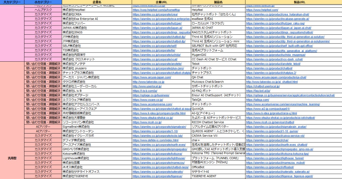 カオスマップを資料請求いただいた方には、各製品の製品名・提供企業・製品URLを記載した「生成AIチャットボットサービス提供企業リスト(Excel)」を無償でご案内いたします。