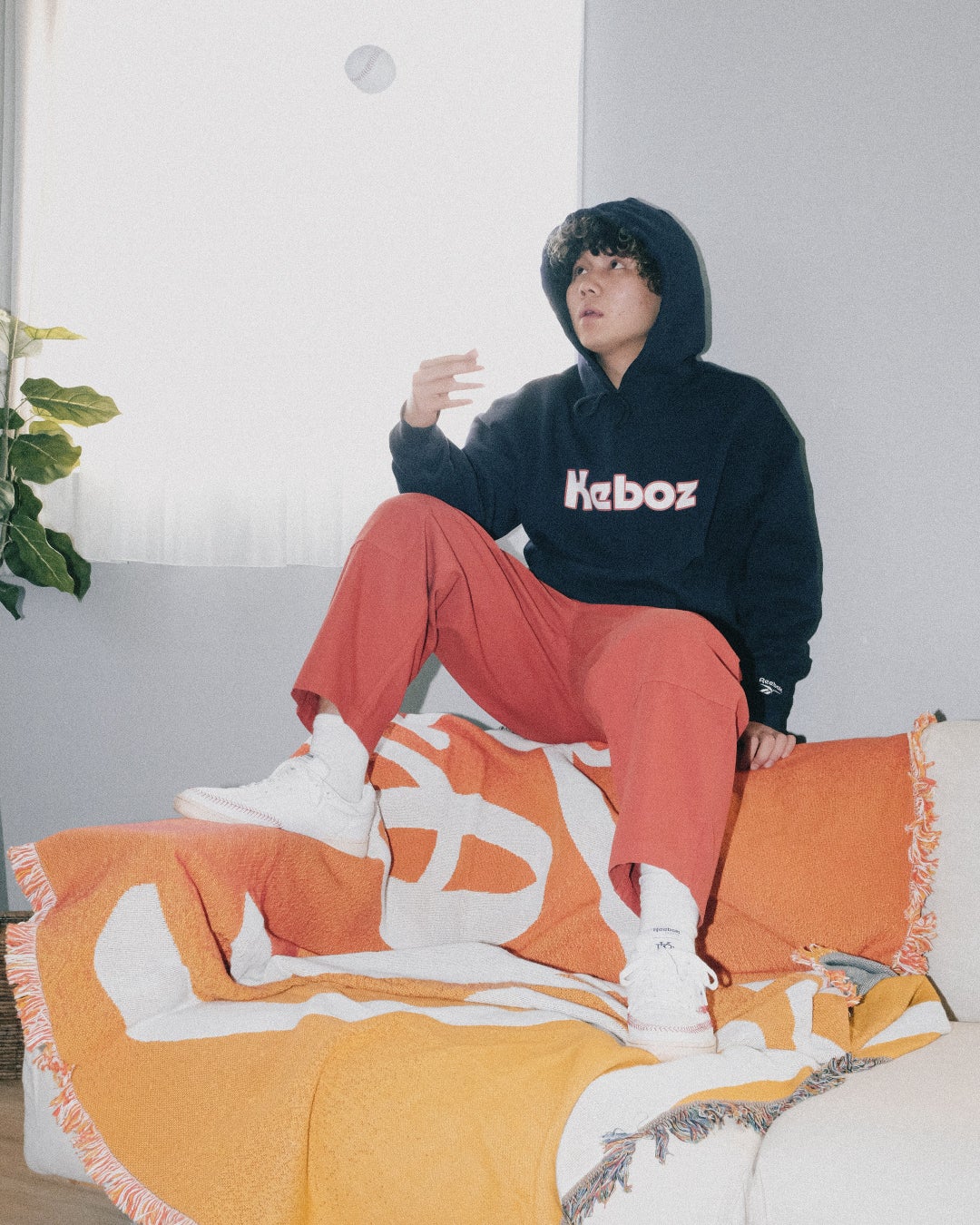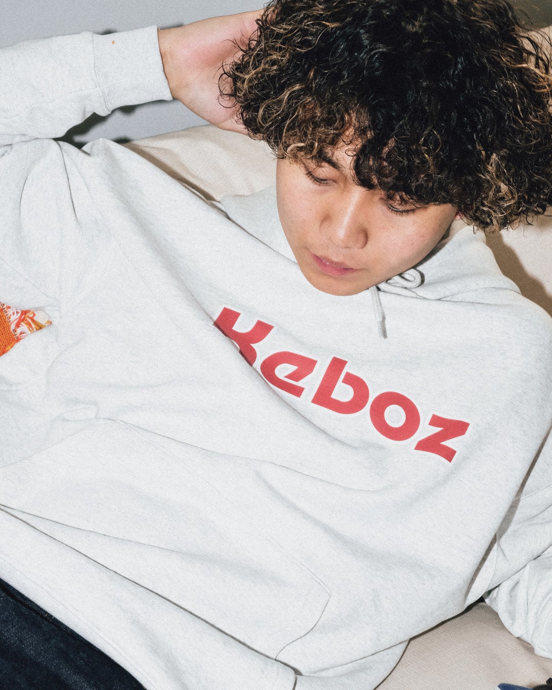更に、スニーカースタイルに合わせやすい、KEBOZのボディーを落とし込んんだトリプルコラボのフーディーも完成。肩や袖周りに少しゆとりのあるシルエットで、着回ししやすいネイビーとグレーの2色を展開。