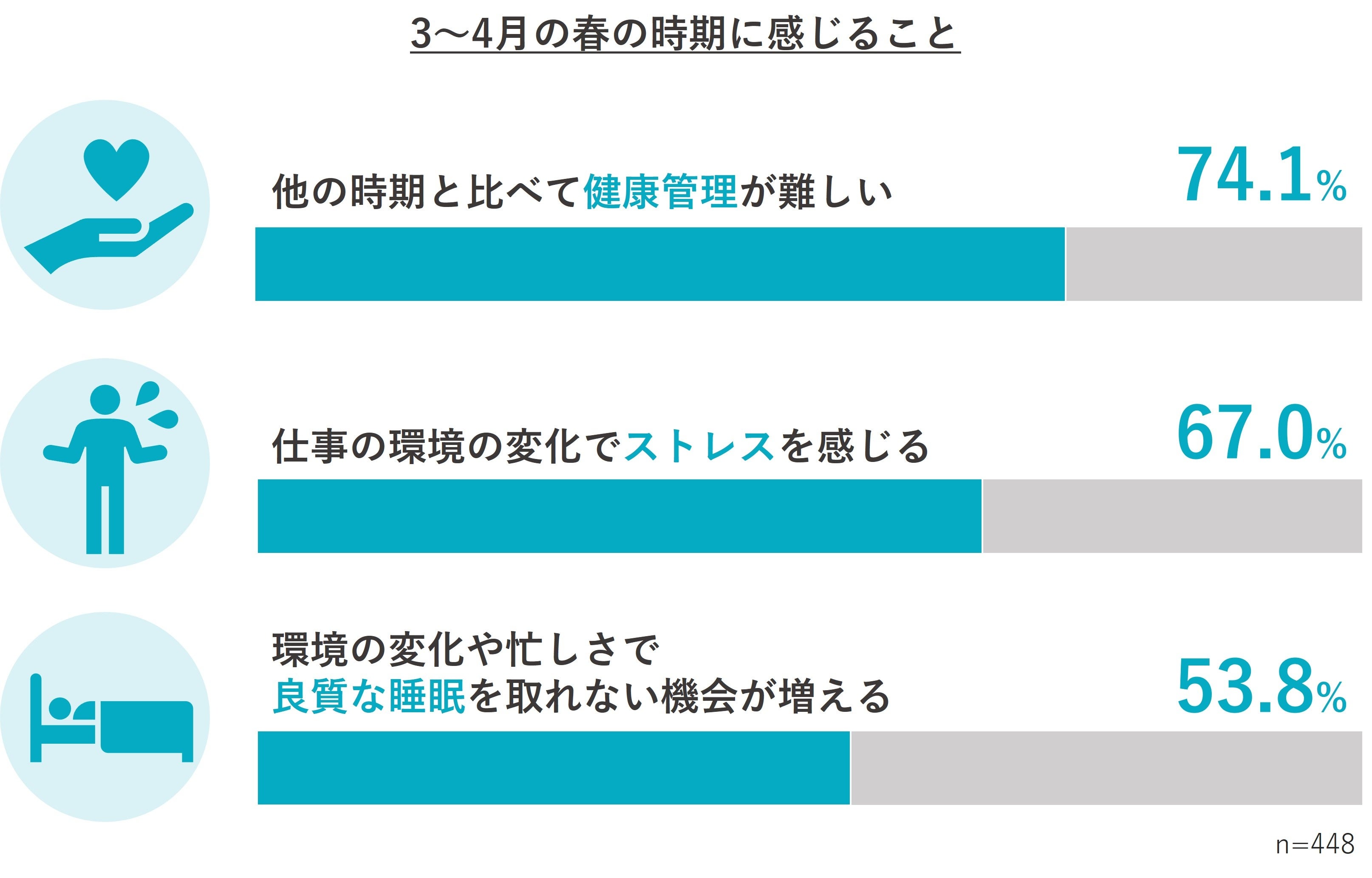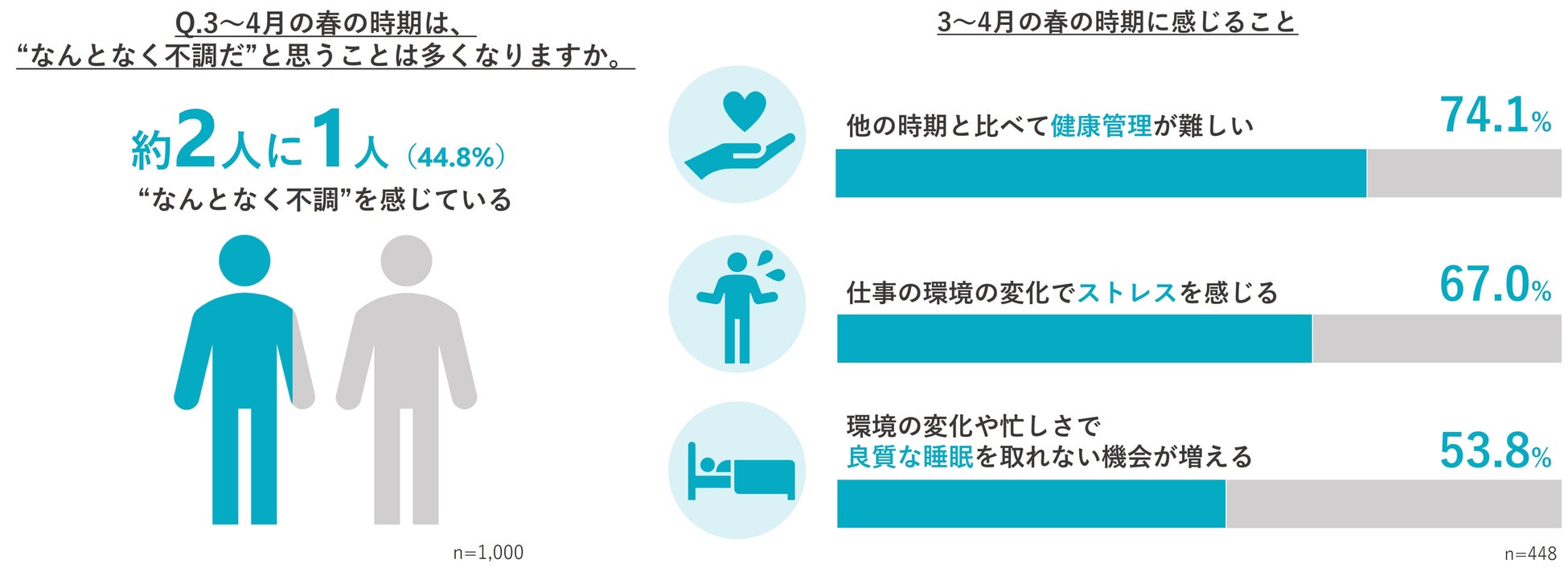 まず、「3~4月の”なんとなく不調”の有無」や「3~4月の生活習慣やストレス・睡眠」について尋ねたところ、全体の約2人に1人(44.8%)が3~4月の春の季節の変わり目に“なんとなく不調”を感じていることが分かりました。さらに“なんとなく不調”を感じると回答した人のうち、74.1%が「他の時期と比べて健康管理が難しい」、67.0%が「仕事の環境の変化でストレスを感じる」、53.8%が「環境の変化や忙しさで良質な睡眠を取れない機会が増える」と回答しました。