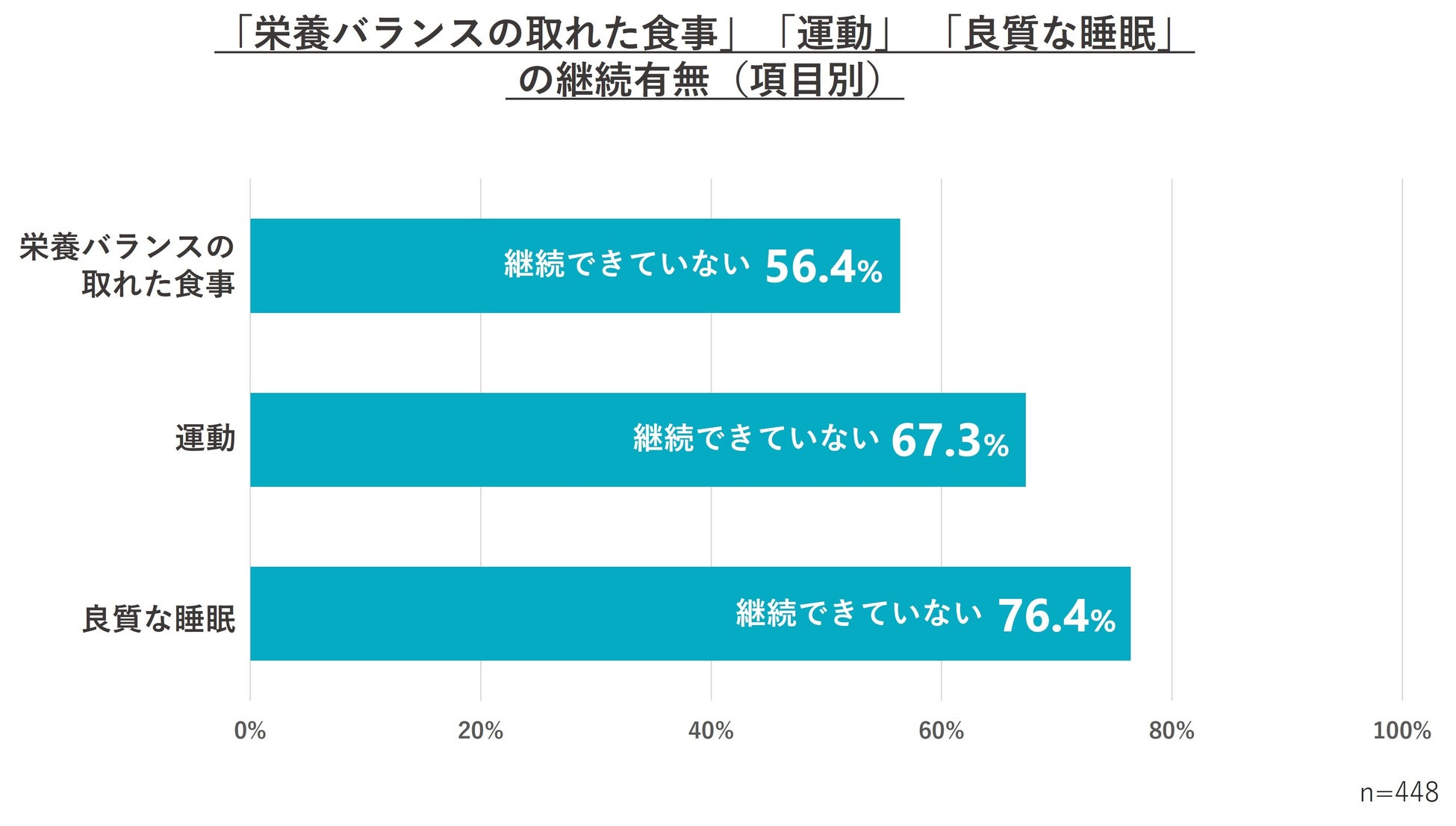 ●項目別で見ると、「栄養バランスの取れた食事」は56.4%、「運動」は67.3%、「良質な睡眠」は76.4%の
