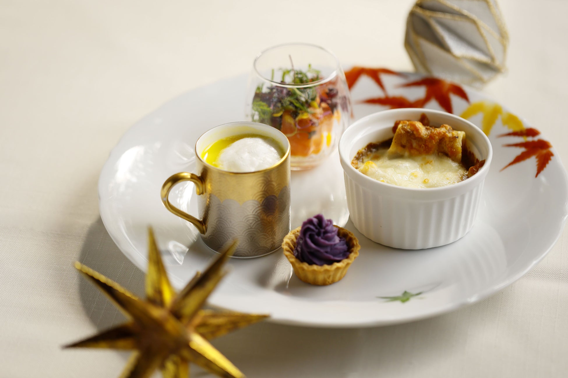 セイボリーは秋の訪れを表現した「かぼちゃのスープ アールグレイの泡」や、奈良県産五徳味噌の甘みと赤ワインのコクがマッチするパスタ料理「奈良県産五徳味噌と赤ワインで煮込んだ牛肉とパッケリのアルフォルノ」などシェフ考案の4品をご提供いたします。