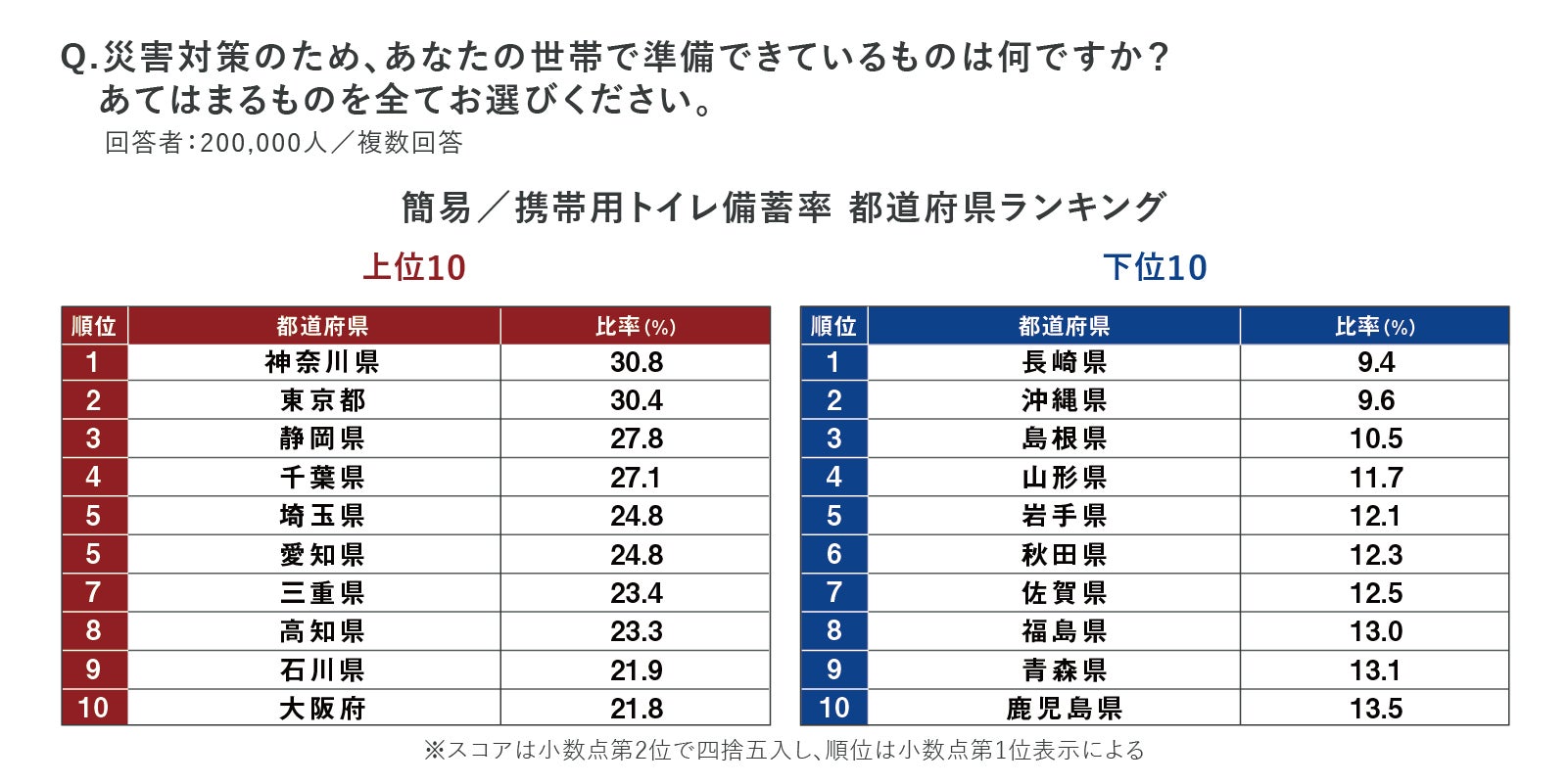 過去の大規模災害発生時、避難所での衛生管理が課題の一つになりました。そこで、都道府県別に「簡易/携帯トイレ」の準備ができている上位を見ると、1位は神奈川県30.8%、2位は東京都30.4%、3位は静岡県27.8%でした。一方下位は、1位は長崎県で9.4%、2位は沖縄県で9.6%、3位は島根県で10.5%でした。