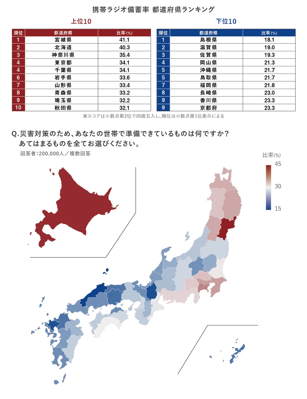 「携帯ラジオ」の準備ができている都道府県の1位は宮城県で41.1%、最下位は島根県の18.1%
