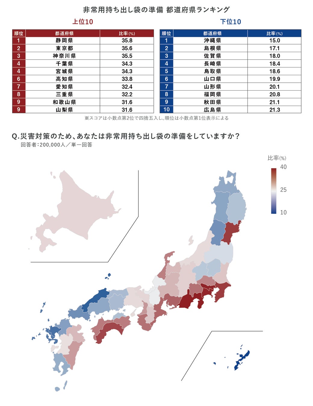 「非常用持ち出し袋」の準備ができている都道府県の1位は静岡県で35.8%、最下位は沖縄県の15.0%