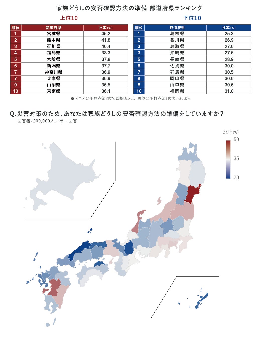「家族どうしの安否確認」の準備ができている都道府県の1位は宮城県で45.2%、最下位は島根県の25.3%