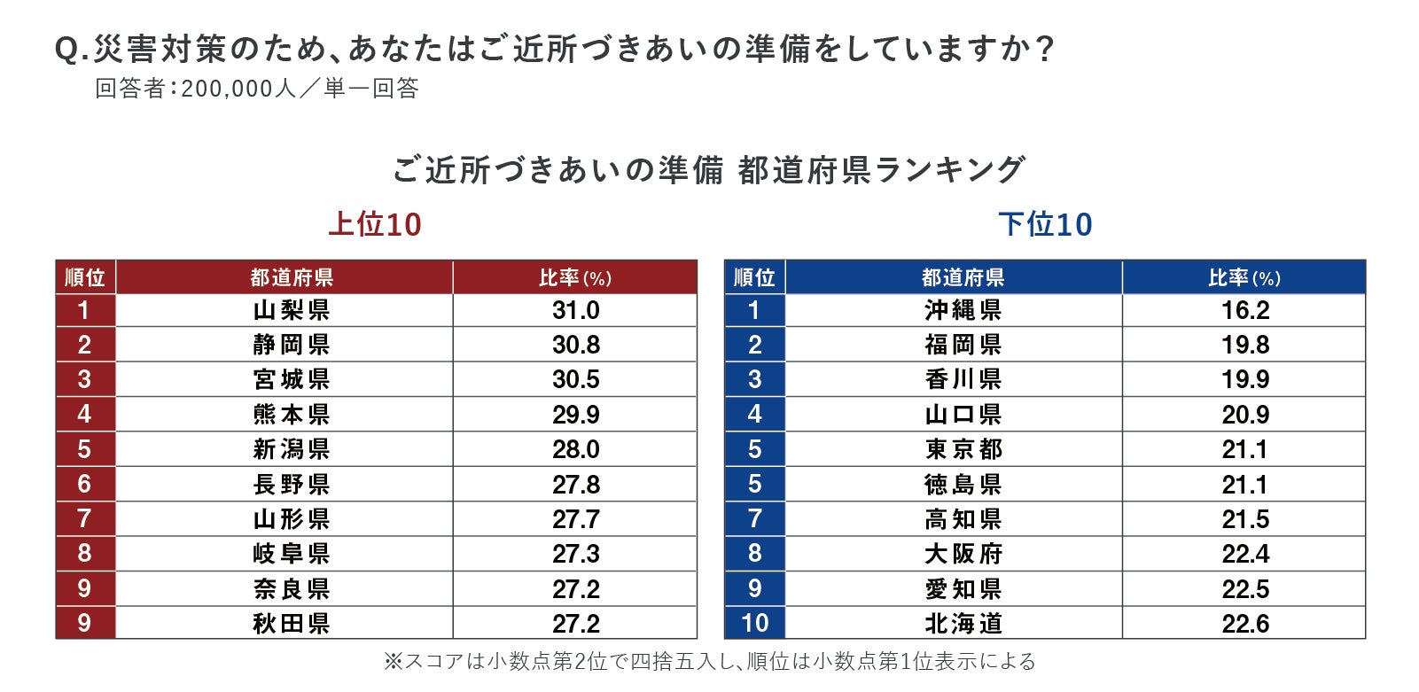 都道府県別に「ご近所づきあい」の準備ができているランキング上位を見ると、1位は山梨県31.0%、2位は静岡県30.8%、3位は宮城県30.5%でした。一方下位は、1位は沖縄県16.2%、2位は福岡県19.8%、3位は香川県19.9%でした。