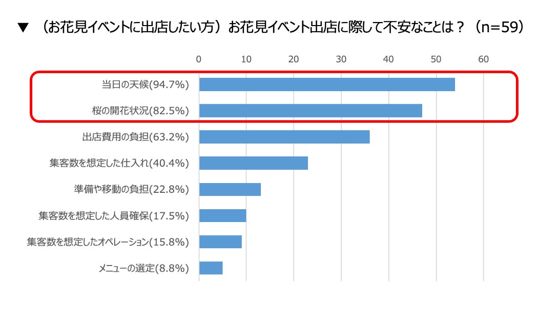 さらに、「お花見イベントに出店したい」と回答された方に対し、出店に際して不安なことを聞いたところ、最も多かったのは「当日の天気」(94.7%)、次いで「桜の開花状況」(82..5%)でした。こちらの2つは集客に大きく影響しそうな要素と言えます。