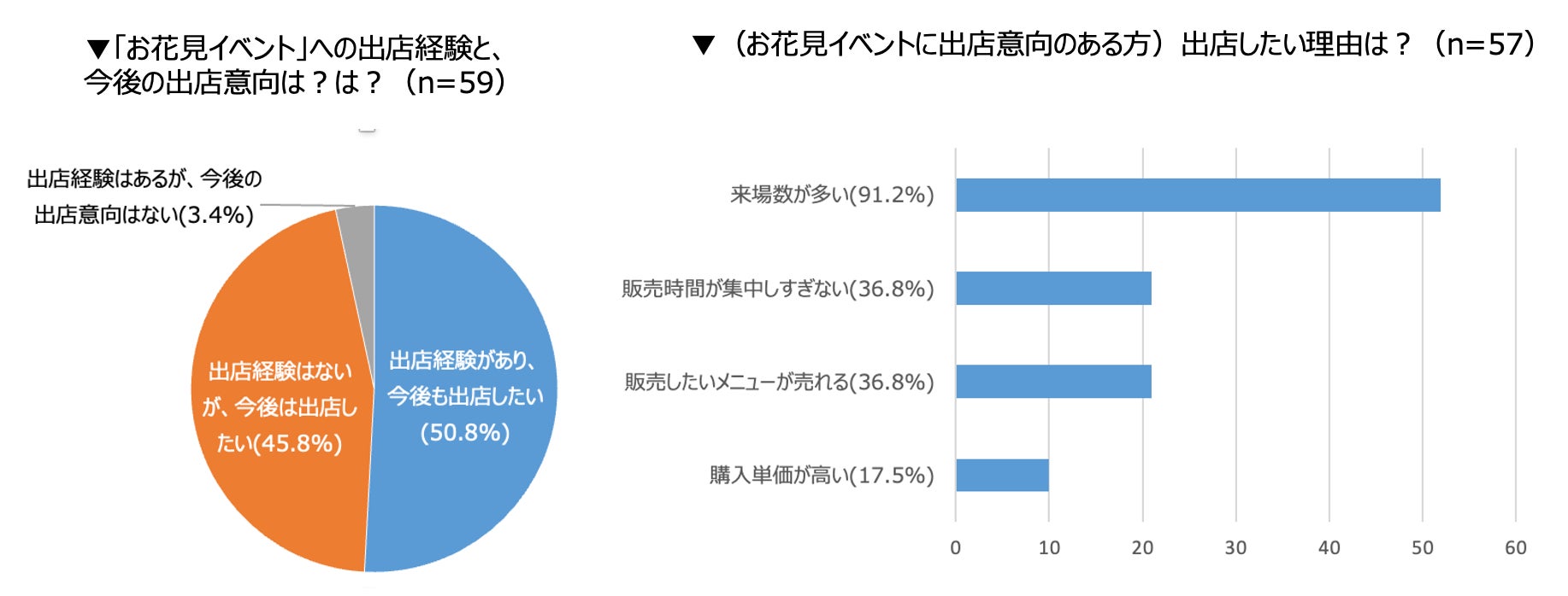 また「お花見イベントに出店したい」と回答した方に、出店したい理由を聞いたところ、圧倒的に多かったのは「来場者数が多い」(91.2%)こと。お花見イベントの集客に大きな期待が寄せられていることが分かります。