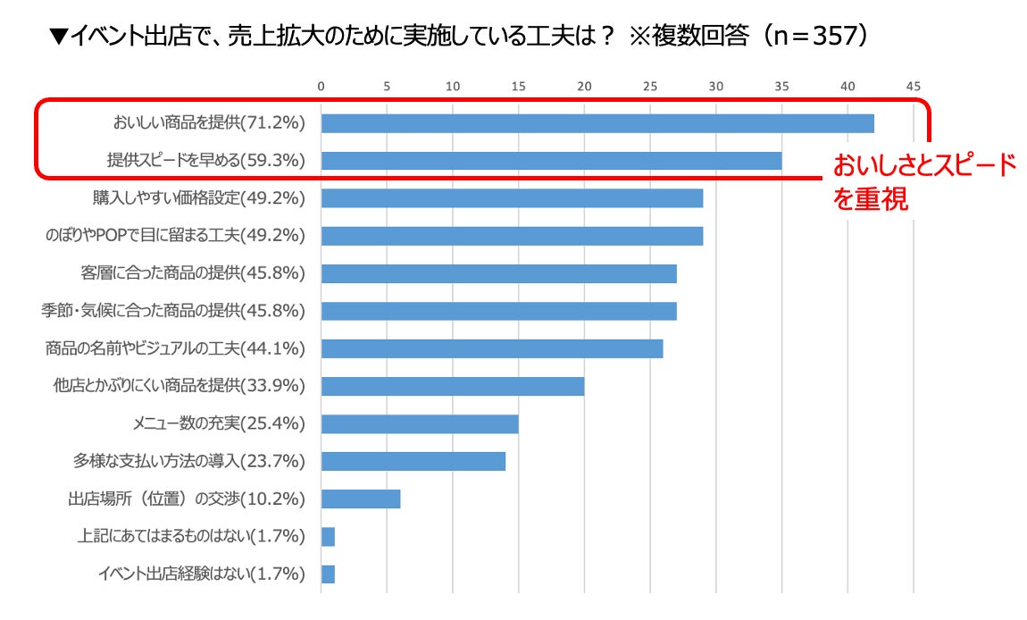 次に、イベント出店で売上拡大のために実施している工夫を聞いたところ、最も多かったのは「美味しい商品を提供する」(71.2%)で、続いて「提供スピードを早める」(59.3%)という結果に。商品のおいしさと提供スピードを最も重視している結果となりました。