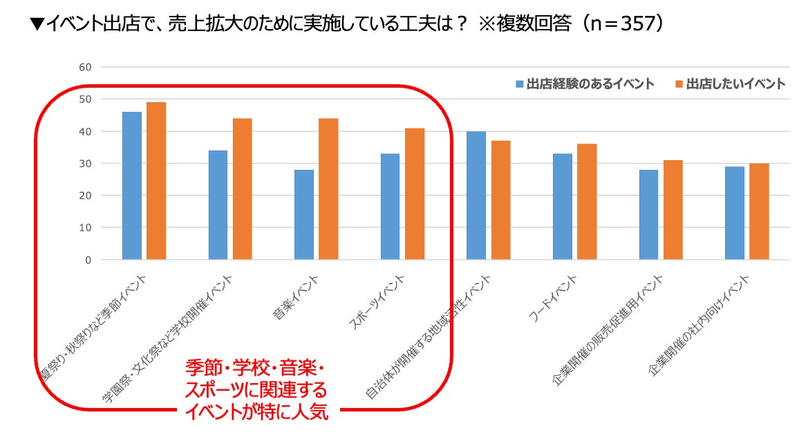 続いて、「出店したことのあるイベント」および「今後出店したいイベント」について聞いたところ、両者とも最も多かったのは、「夏祭り・秋祭りなど季節イベント」(出店経験あり:78%、今後出店したい:83.1%)でした。