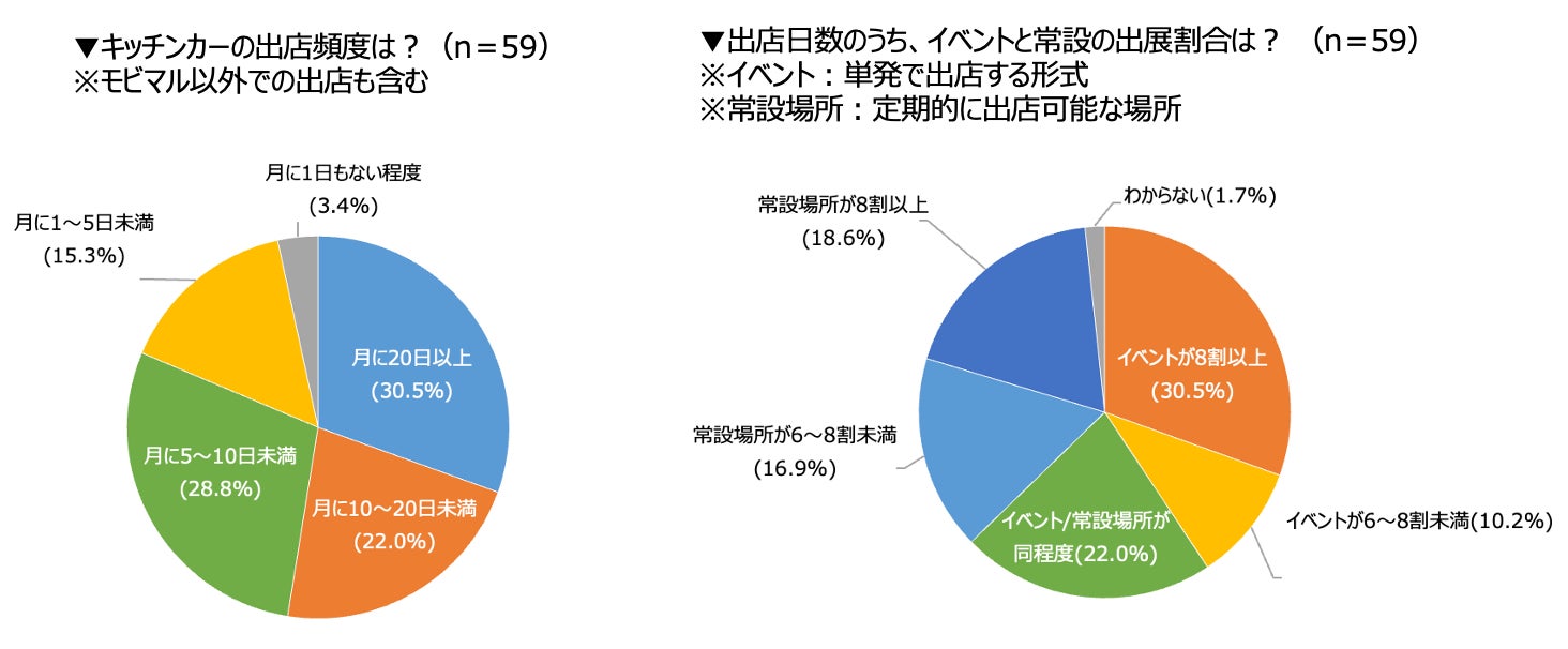 まず、キッチンカーの出店頻度および、イベント・常設場所の出店割合について聞きました。出店頻度について最も多かったのは「月に20日以上」(30.5%)で、続いて「月に5〜10日未満」(28.8%)、「月に10〜20日未満」(22.0%)と分散される結果に。それに関連して、イベント・常設場所の出店割合については、「イベントが8割以上」(30.5%)を筆頭に、「イベント・常設場所が同程度」(22.0%)「常設場所が8割以上」(18.6%)など出店割合も割れるかたちになりました。