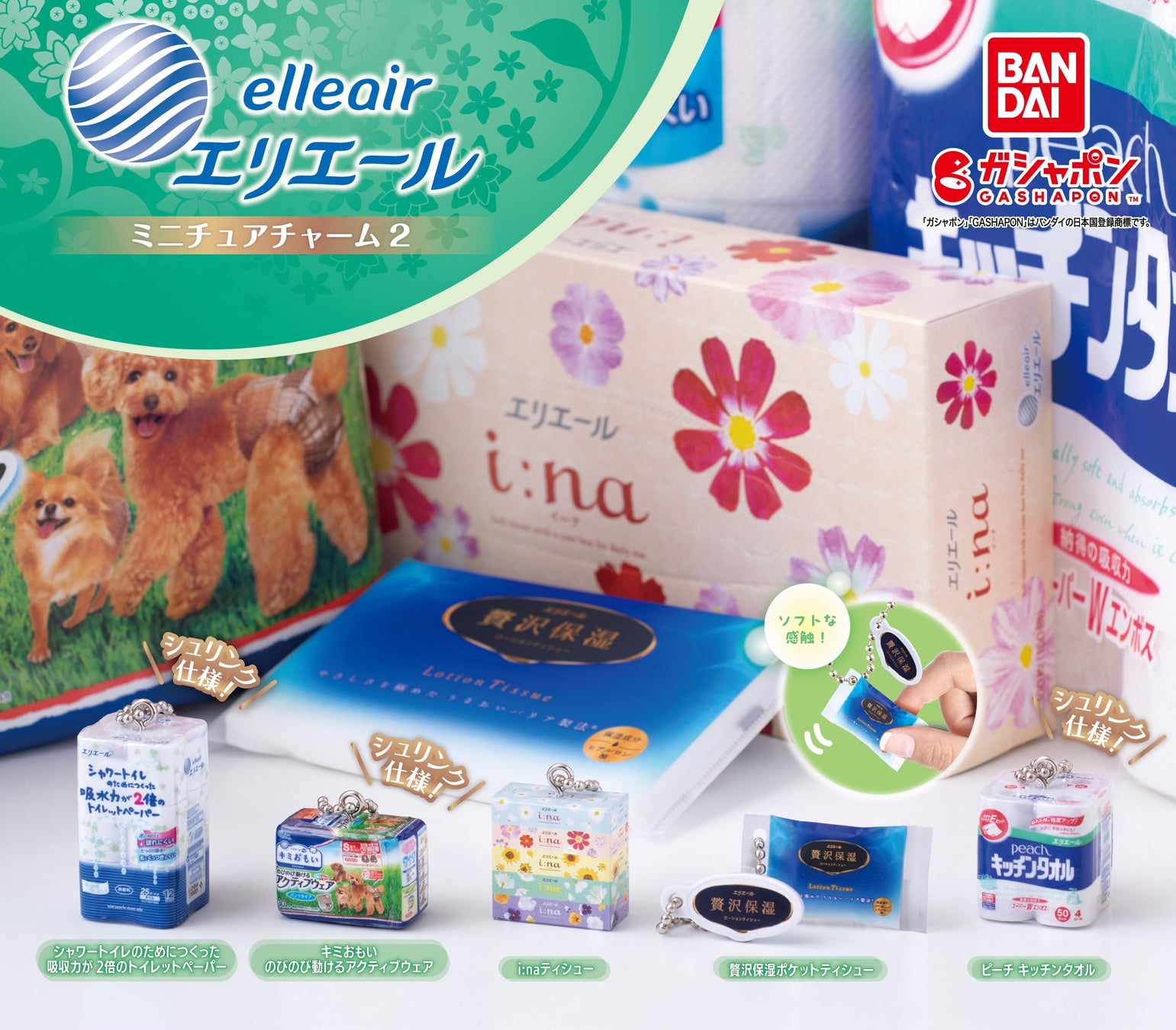 「エリエール ミニチュアチャーム2」では、手書き風フォントがほのぼのとした雰囲気の「エリエール シャワートイレのためにつくった吸収力が2倍のトイレットペーパー」、ペット用品では初登場となる「エリエールPet キミおもい のびのび動けるアクティブウェア」、花柄がかわいらしい「エリエール i:naティシュー」、本物そっくりのソフトな感触が楽しめる「エリエール 贅沢保湿ポケットティシュー」、台所の定番品としてなじみ深い「エリエール ピーチキッチンタオル」の計5種類がラインナップ。