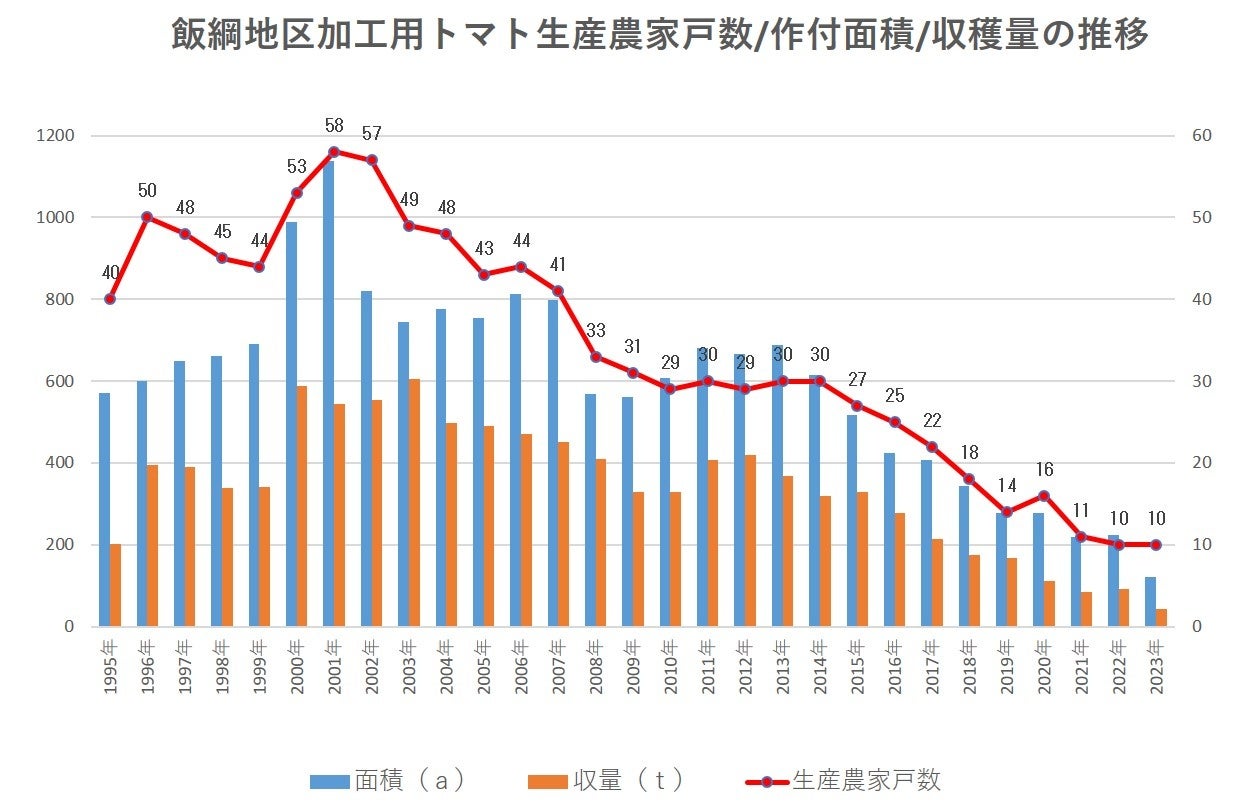 加工用トマトは生食用と異なり、地面を這うように広がって育つ露地栽培であり、中腰での作業のため収穫作業にも負担がかかります。こうした作業負担に加え生産者の高齢化、安価な輸入原料に押され、栽培面積は年々減少しています。