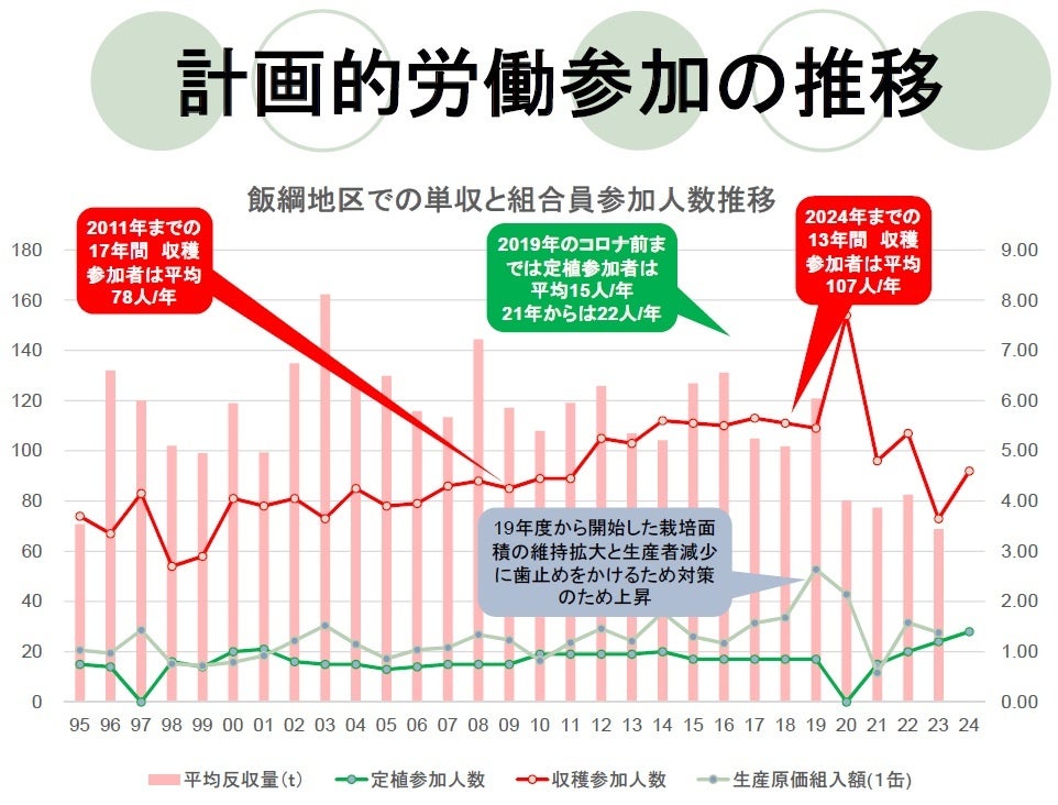 過酷な気候変動の中で第一次産業を続けていくことは大変だと思います。消費者が食べたり、利用するだけではなく、つくることに参画していくという計画的労働参加を、30年も前に考えたこと、そしてそれがまた30年続いているということは本当にすごいなと改めて感じます。新しい世代にもこれが受け継がれるように、私たちも色々考えていきたいです。