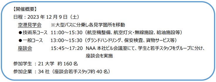 この度の空港見学会及び座談会は、千葉県大学就職指導会様※のご協力を得て、県内の大学生の皆さま に、成田空港の様々な仕事を実際に見て知っていただき、さらに若手空港スタッフと話すことで、航空/空港業 界の業務やそこで働く意義に理解を深めてもらい、就職先の選択肢に入れていただくことを目的として開催するも のです。