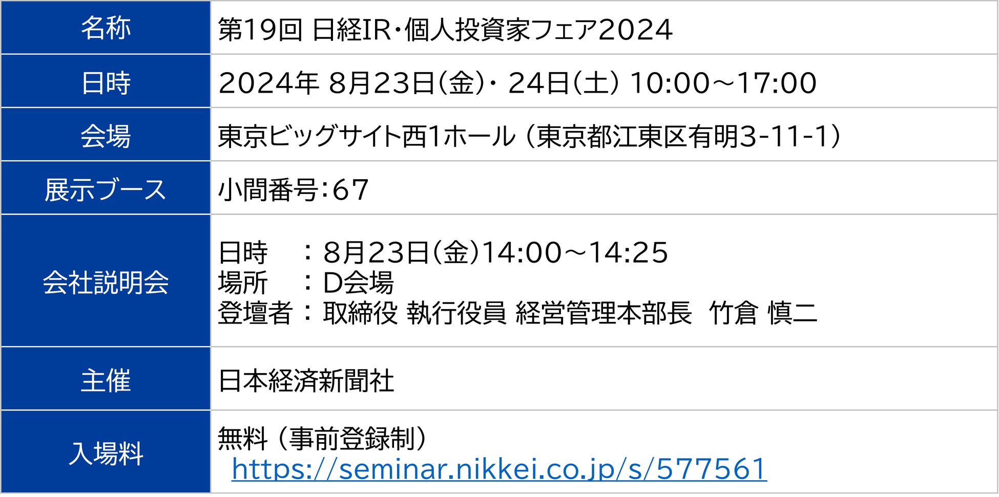 「第19回 日経IR・個人投資家フェア2024」出展のお知らせ