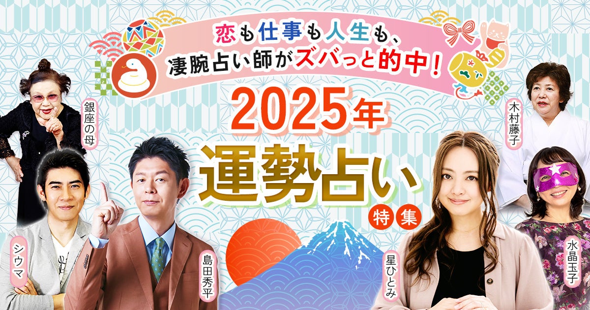 各メディアで活躍中の凄腕占い師たちが一挙集結!豪華特別パックメニューをはじめ無料で楽しめるメニューも!「2025年運勢占い特集◆恋も仕事も人生も、凄腕占い師がズバっと的中!」