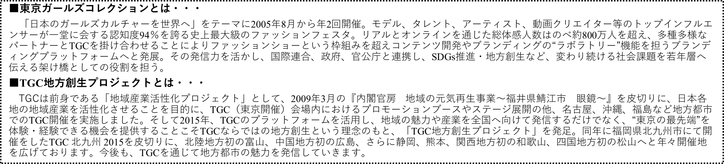 TGCでは、TGCのプラットフォームを活用し、地域の魅力や産業を全国へ向けて発信するだけでなく、“東京の最先端”を体験できる機会を提供することこそTGCならではの地方創生という理念のもと、2015年に「TGC地方創生プロジェクト」を発足。同年に開催をした「TGC 北九州 2015」を皮切りに、広島、富山、静岡、熊本、和歌山と年々開催地域を広げてまいりました。