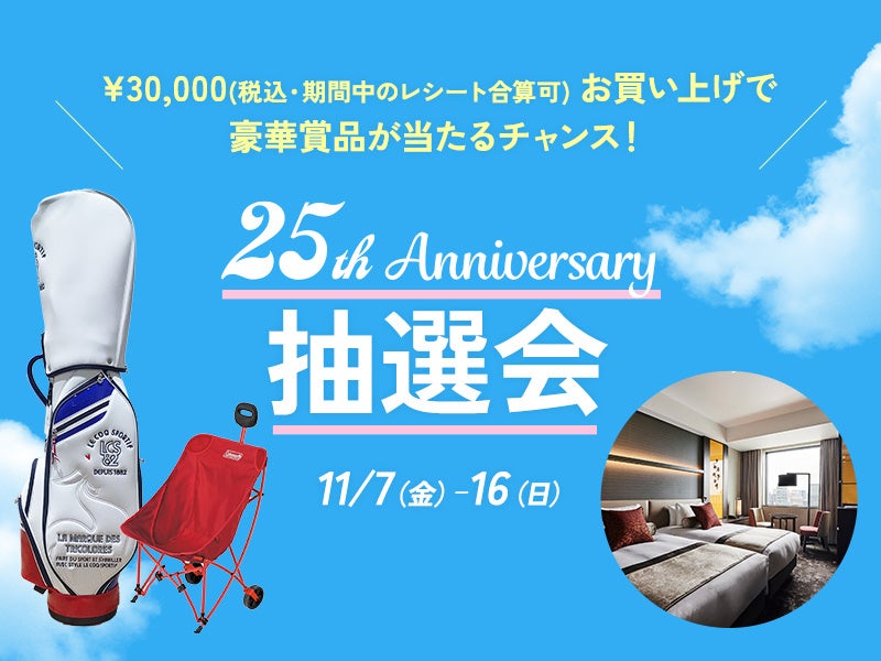 りんくう周辺エリアのホテル宿泊券や、アウトドアに大活躍のキャンプ用品、ファッションアイテム、グルメギフトセット、プレミアム・アウトレットお買物券など、豪華賞品が当たるハズレなしの「25th Anniversary大抽選会」を開催します。