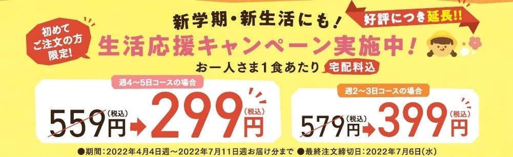 これから「PAKU MOGU」を始める方は、週4~5日コースのご注文でお1人さま1食あたり299円よりご注文できる「生活応援キャンペーン」をご利用いただけます。ご好評につき、期間を延長しました!ぜひこの機会にお試しください。