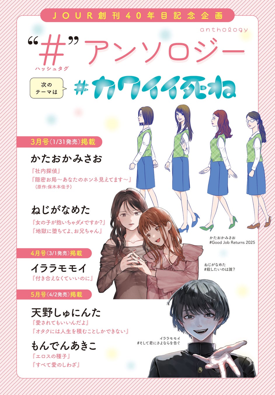 「#カワイイ死ね」をテーマに超豪華作家陣が読切作品を執筆! トップバッターを飾るのは、かたおかみさお先生とねじがなめた先生! 漫画誌「JOUR3月号」1月31日発売