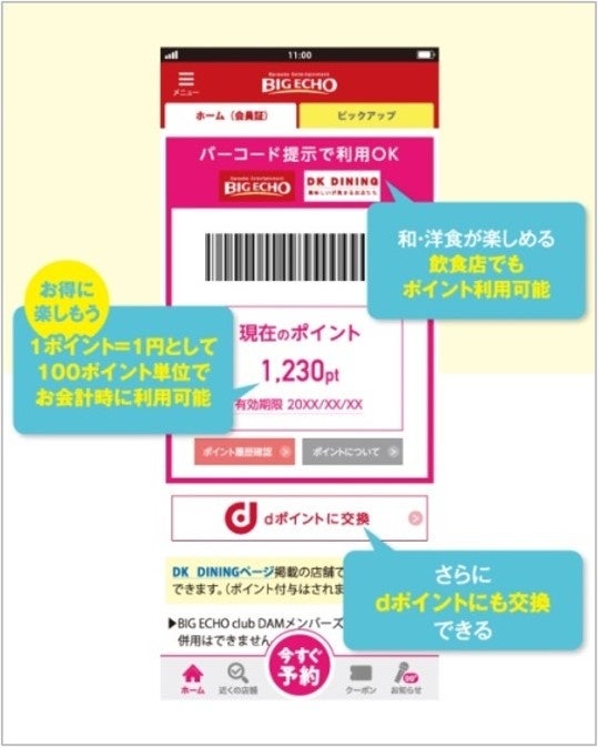 *2 「DKダイニング」で貯まったポイントは、ビッグエコーで利用することも可能(100ポイント単位)です。