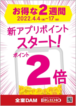 ビッグエコー公式アプリの新ポイントシステムへの移行を記念して、【ポイント2倍キャンペーン】を実施します。