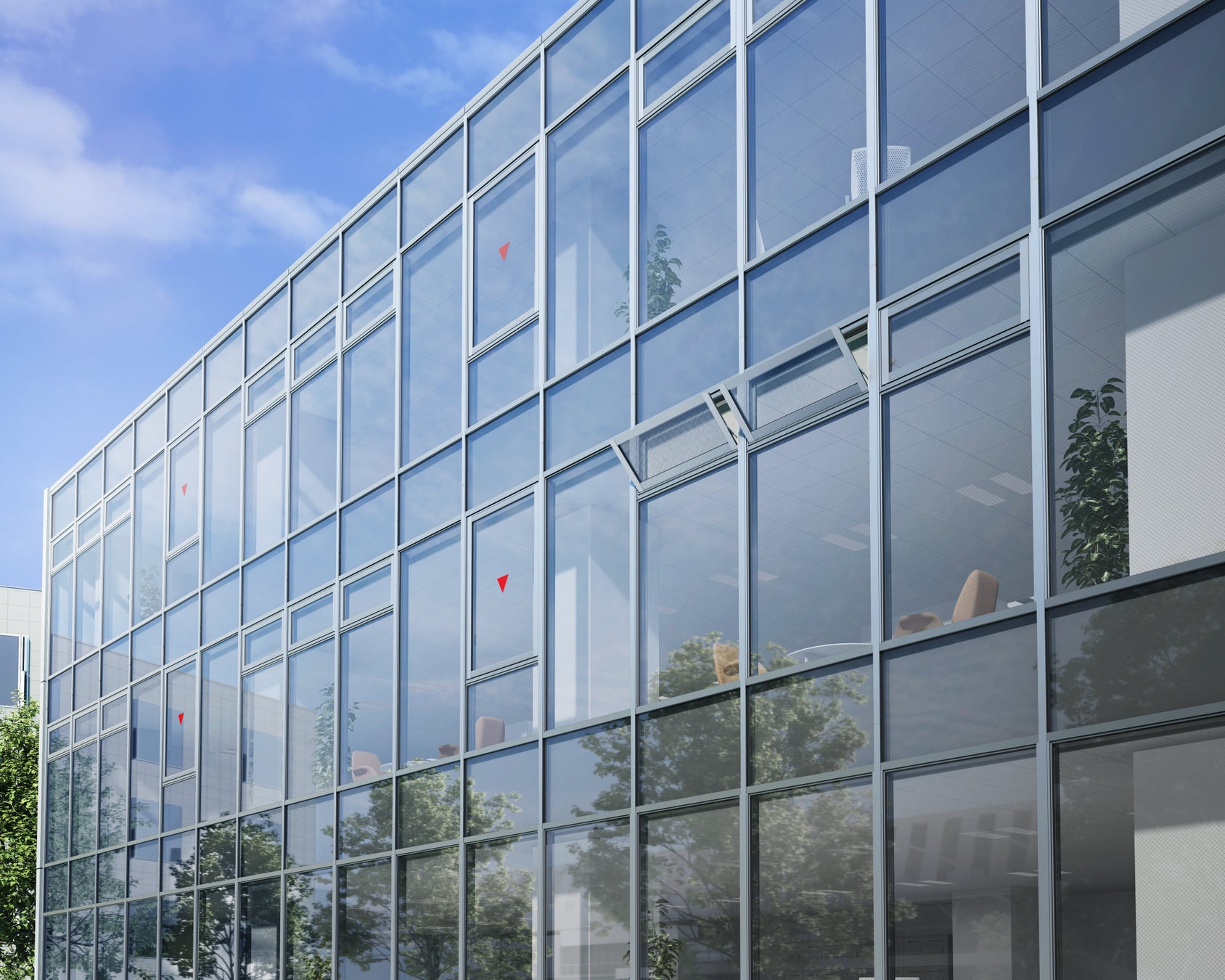 この度、関東地方発明表彰において発明奨励賞を受賞した中低層用カーテンウォール型フロントサッシ「MLシリーズ」は、新しい構造の採用により高い性能とスリムなデザインを兼ね備えています。災害の増加を背景に排水構造を工夫し安定した水密性を確保したほか、方立・無目の嵌合ラインを隠すなど細部までノイズレスデザインにこだわり、美しいファサードを実現します。