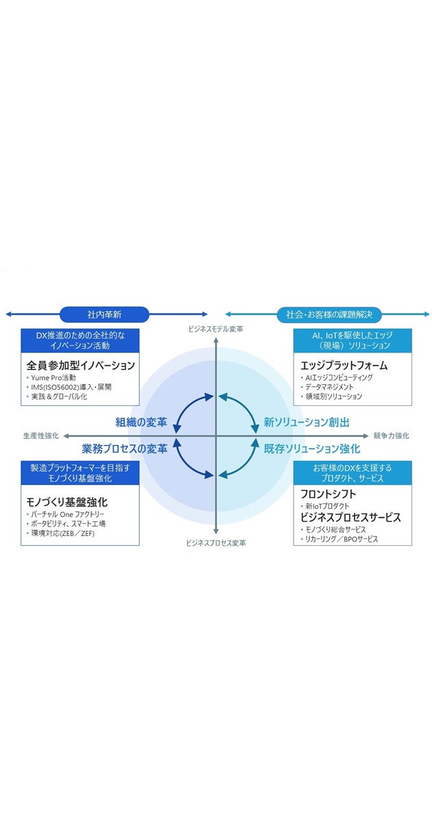 これを踏まえて策定したのが「DX戦略2025」です。4象限における社内と社外のプロセスを相互に循環させることで、価値創造の相乗効果をさらに高めます。全員参加型イノベーション活動やモノづくり基盤強化など、会社としての創造性と生産性を高める社内革新で生み出した力を、お客様のDX化を支えるプロダクトやビジネスプロセスサービスの強化に活かしていきます。また、「新ソリューション創出」においては、これまで培ったエッジの技術により生み出される多様なデータをつなぐ「エッジプラットフォーム」を構築し、提供価値の拡大を目指します。