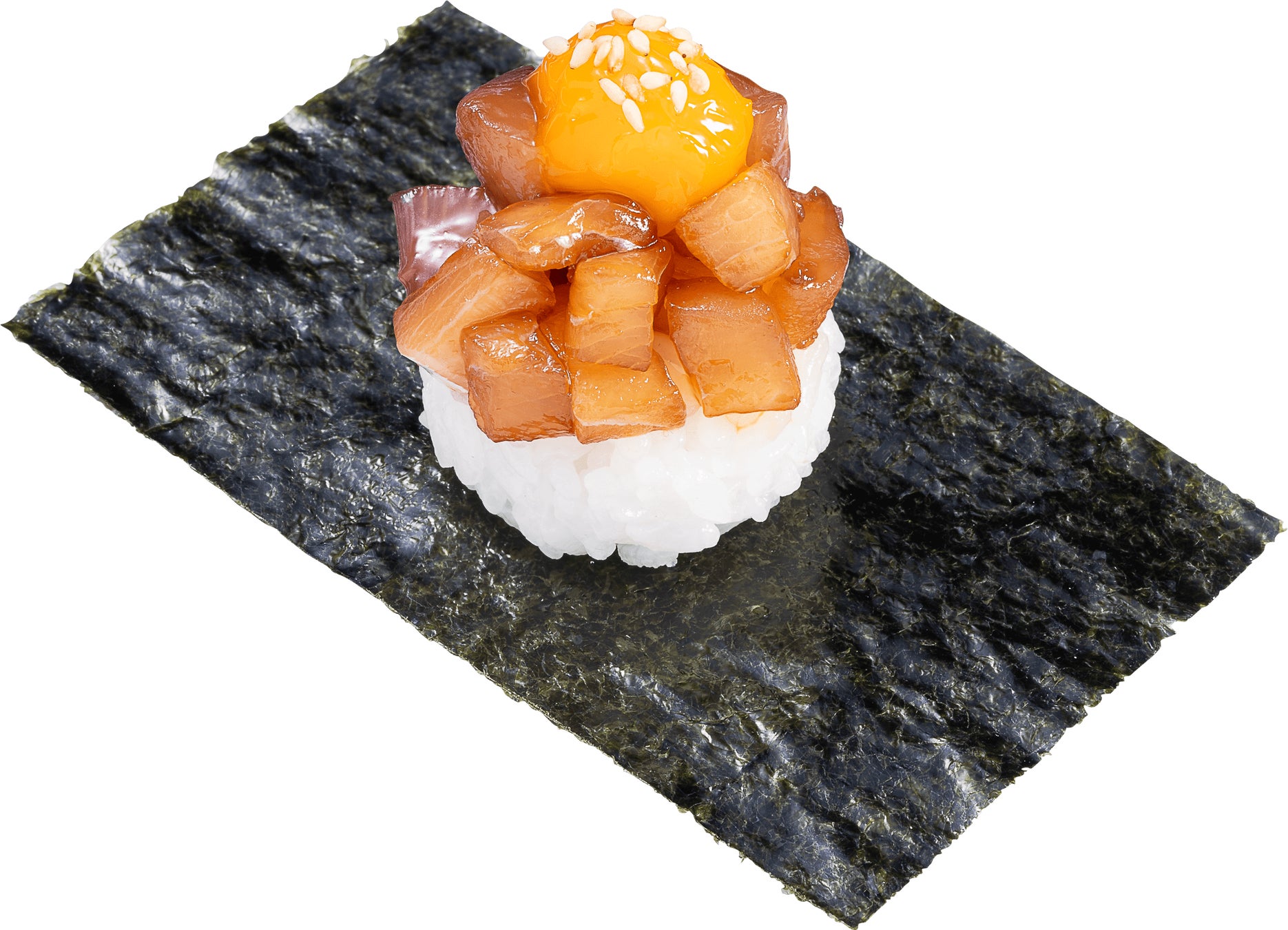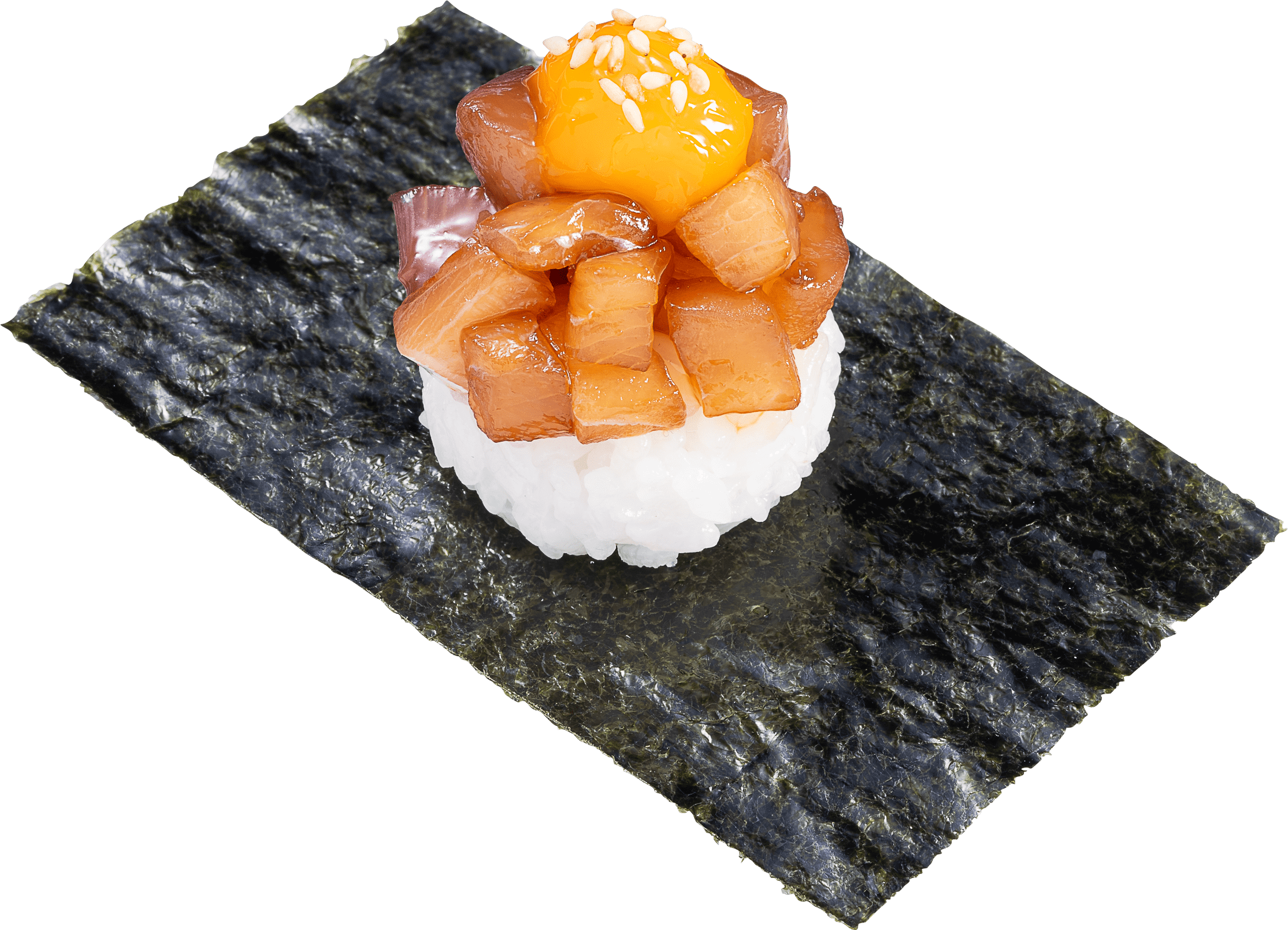 寒ぶりのぶつをオリジナルのタレに漬け、卵黄ソースといりごまを合わせました。