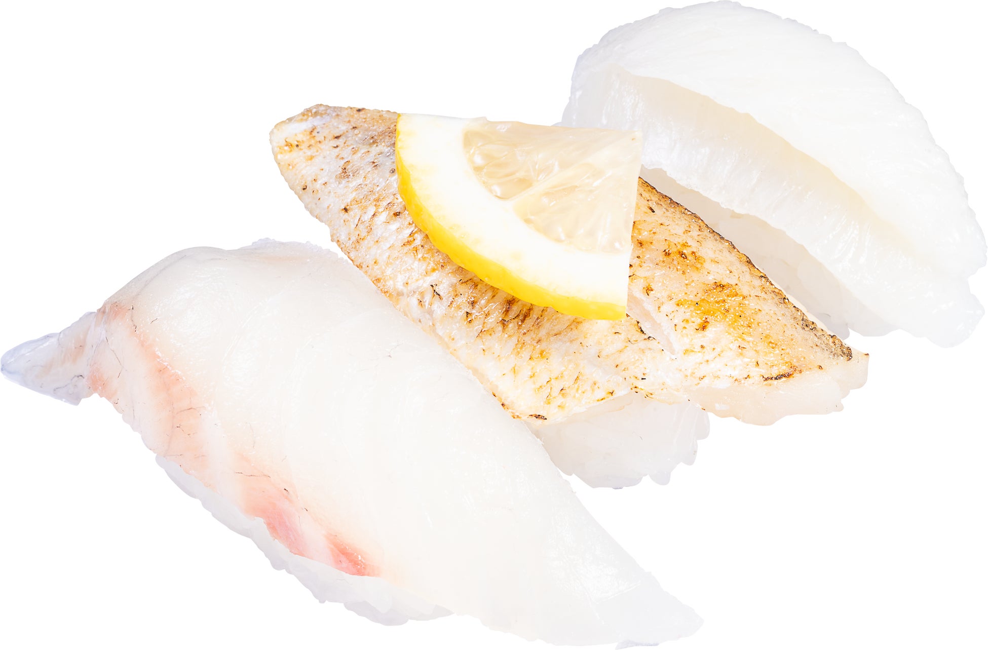 活〆真鯛、のどぐろ塩炙り、えんがわ二枚重を一皿で楽しめます。