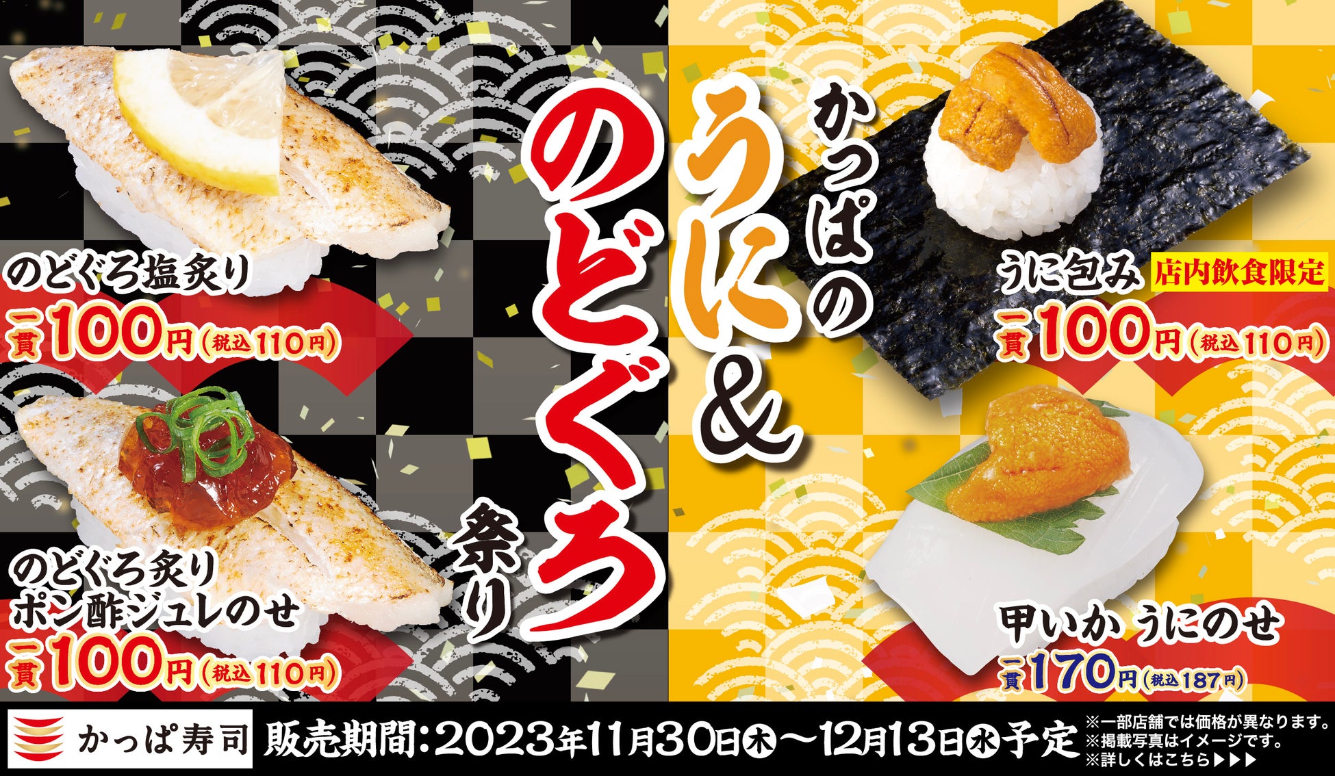 高級ネタ「うに」&「のどぐろ」を一皿100円(税込110円)より堪能する14日間 冬の味覚が到来『かっぱのうに&のどぐろ祭り』開催